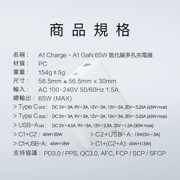 支持協議:PD3.0/PPS, QC3.0, AFC, FCP/SCP/SFCP