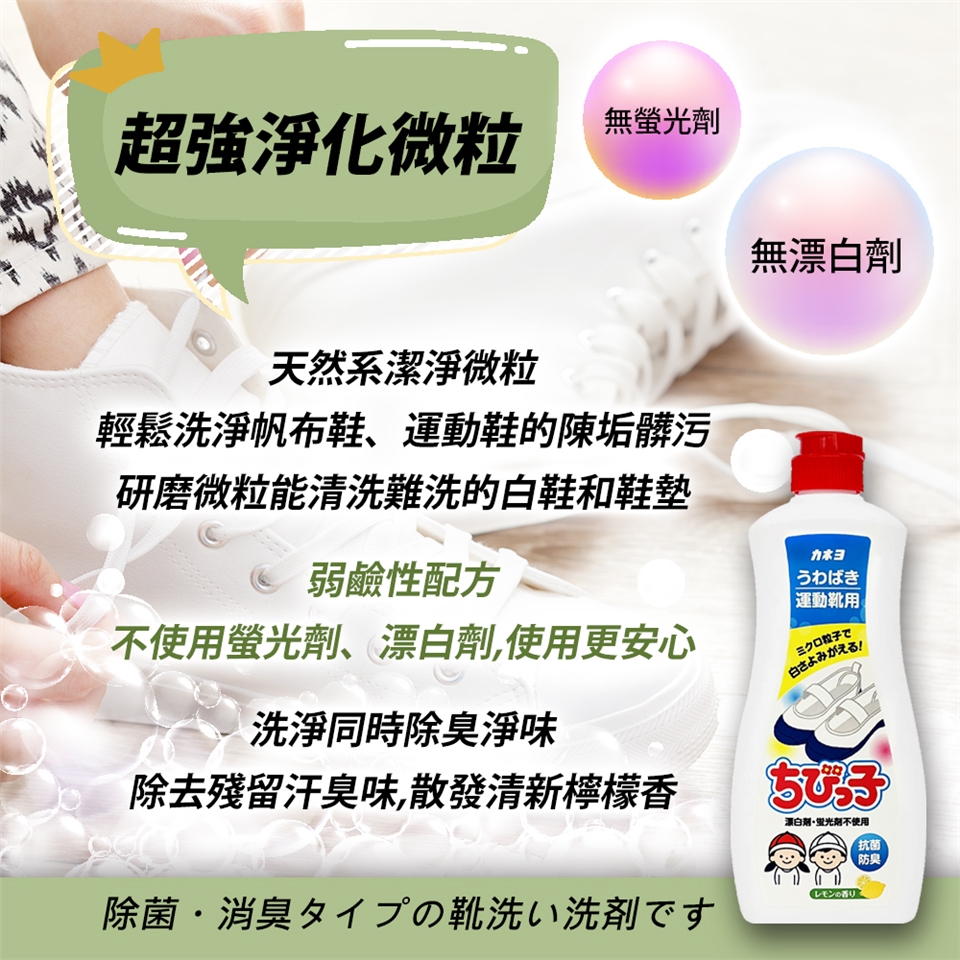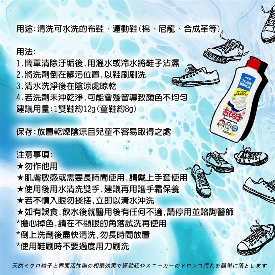 ●透過天然系細緻微粒,輕鬆洗淨帆布鞋、運動鞋的汙垢灰塵