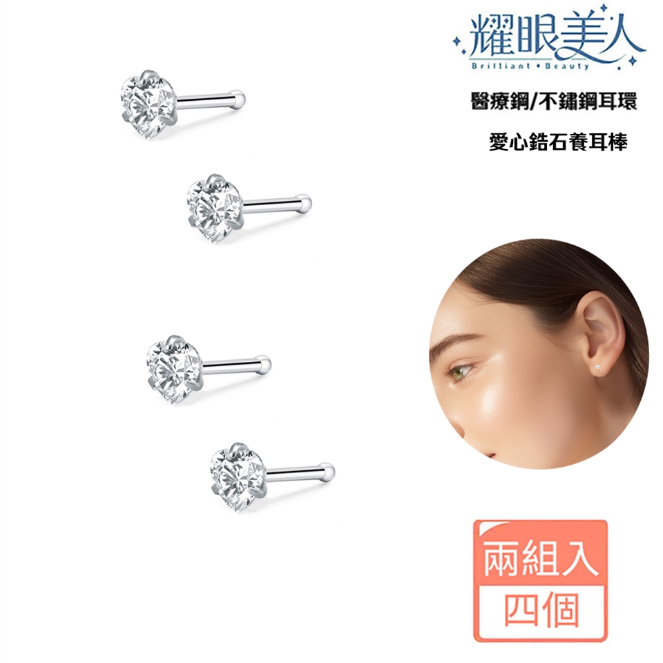 耀眼美人閃耀愛心鋯石不鏽鋼鋯石養耳棒不銹鋼養耳棒兩對入共四個