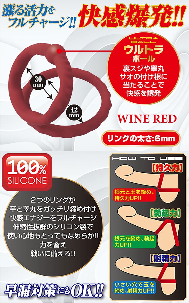 雙環設計除增強耐力更可提升硬挺度和射精能力。當球體位位於睾丸後方刺激著前列腺,帶來強烈的射精感,或置於肉棒側身刺激按摩,並透過不同的佩戴方式來取得不同的快感享受!