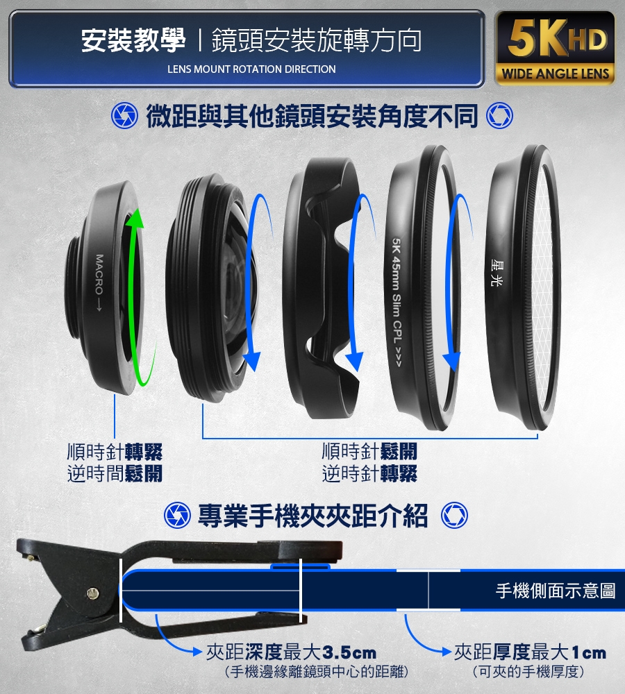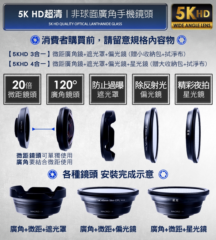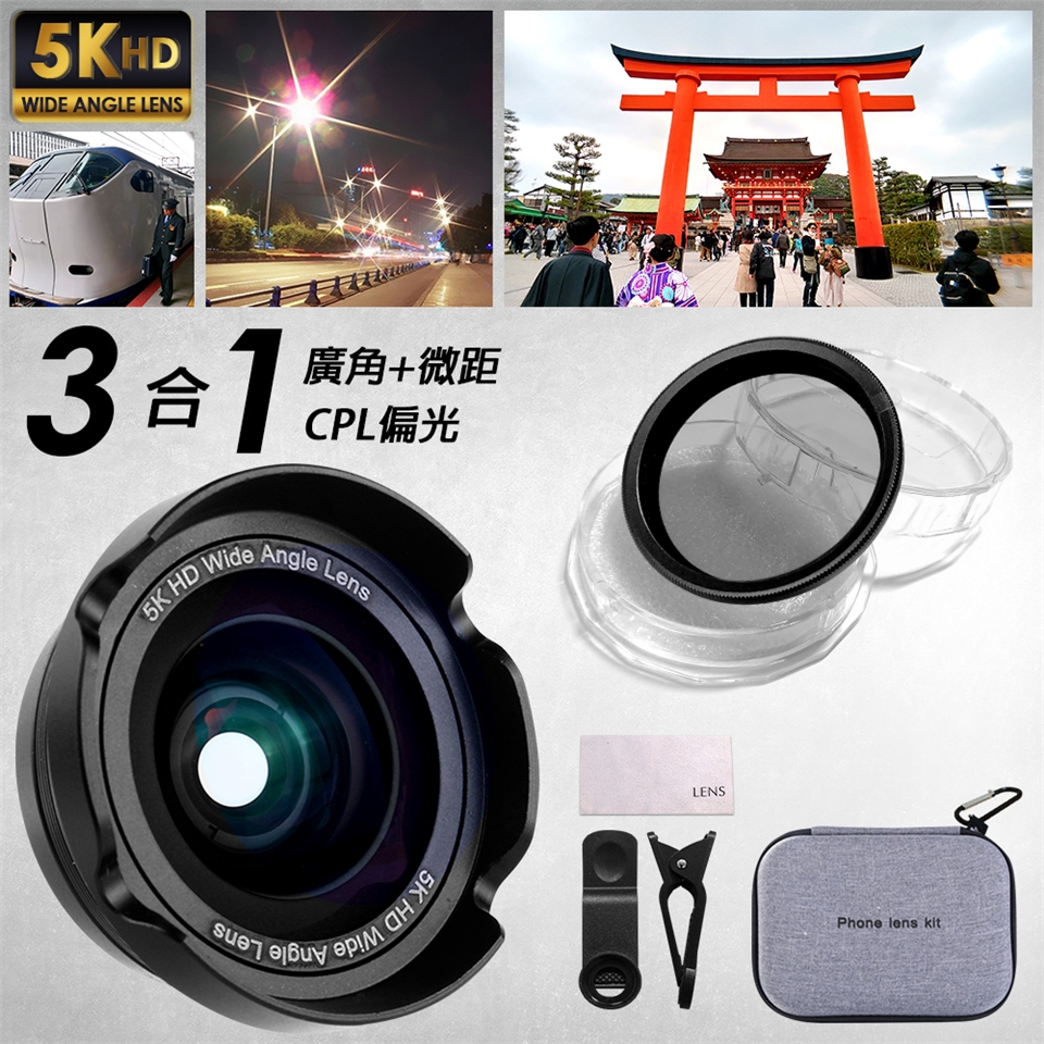 【5K HD 3合1】微距廣角鏡頭+遮光罩+偏光鏡(贈小收納包+拭淨布)
