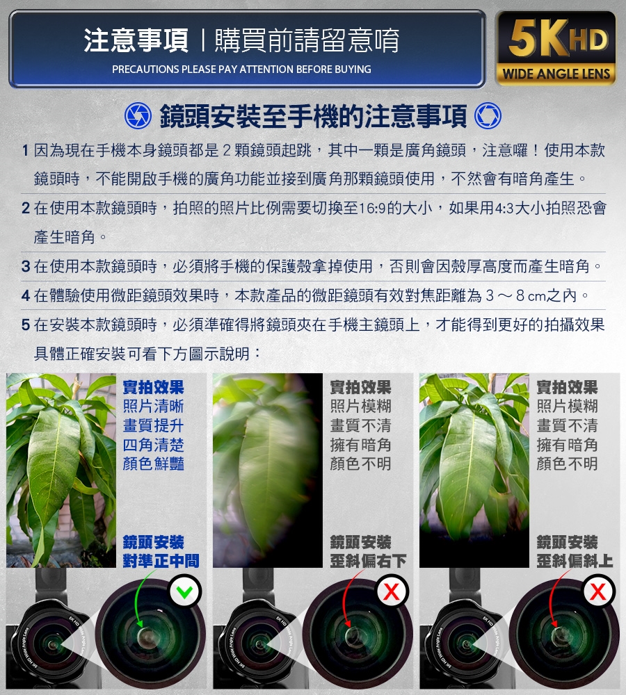 3.在使用本款鏡頭時,必須教手機的保護殼拿掉使用,否則會因殼厚高度而產生暗角
