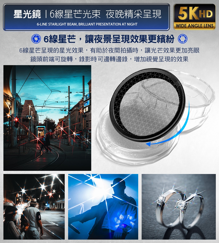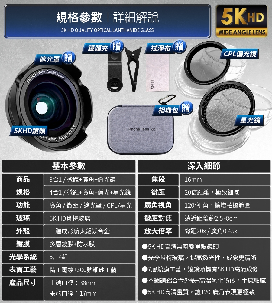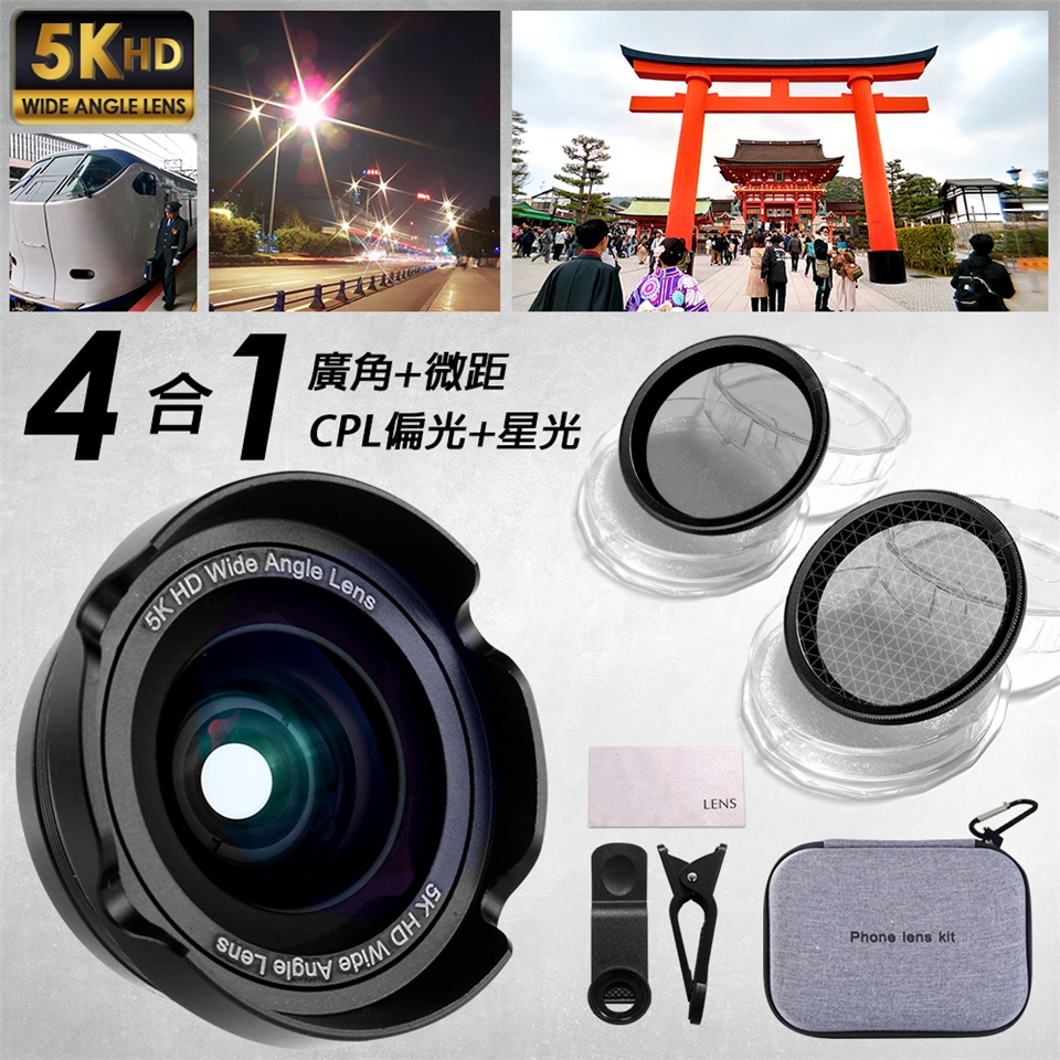 【5K HD 4合1】微距廣角鏡頭+遮光罩+偏光鏡+星光鏡(贈大收納包+拭淨布)