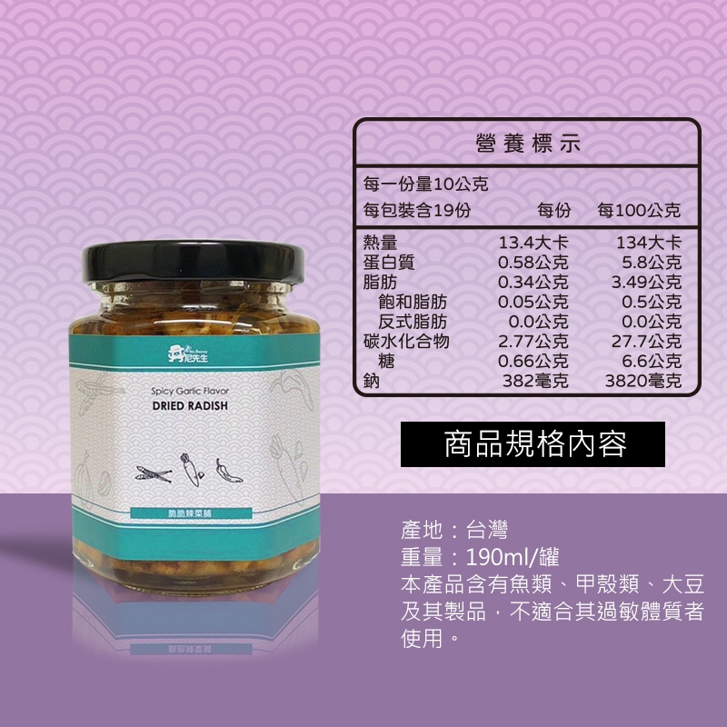 ◆成份:蘿蔔乾、大豆油、新鮮辣椒、豆豉、砂糖、非基改醬油、食鹽、香油、胡椒粉、小魚干、冬蝦、蒜頭
