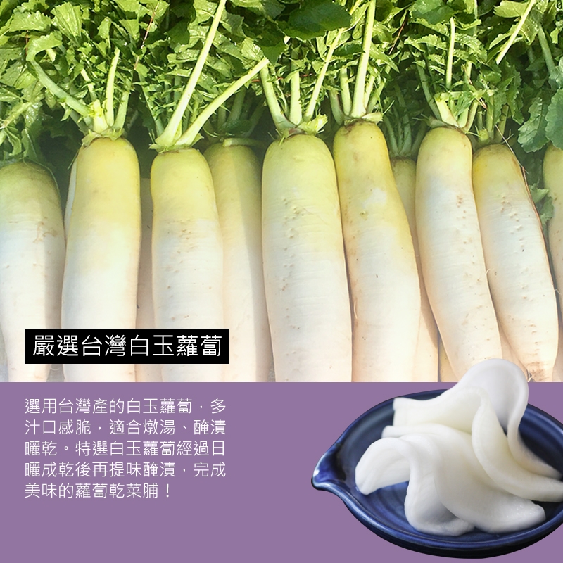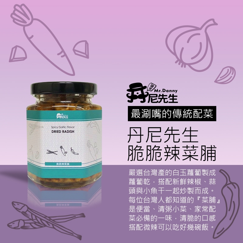 我們使用台灣自產的白玉蘿蔔製成蘿蔔乾在製成『菜脯』,所有的原料都是精挑細選的嚴選原料,為了提升口感與風味特別添加了小魚乾、冬蝦與豆豉,讓整罐【脆脆辣菜脯】風味更豐富,真的是會讓然一吃再吃好美味!