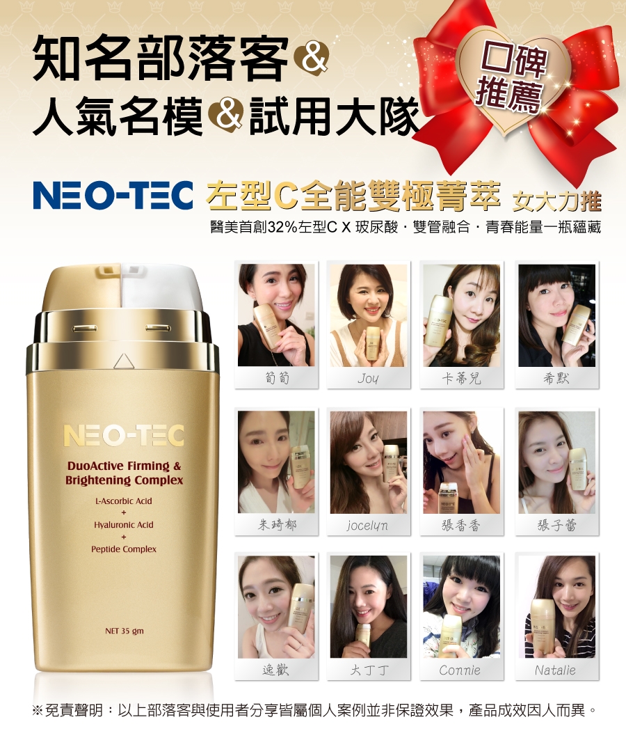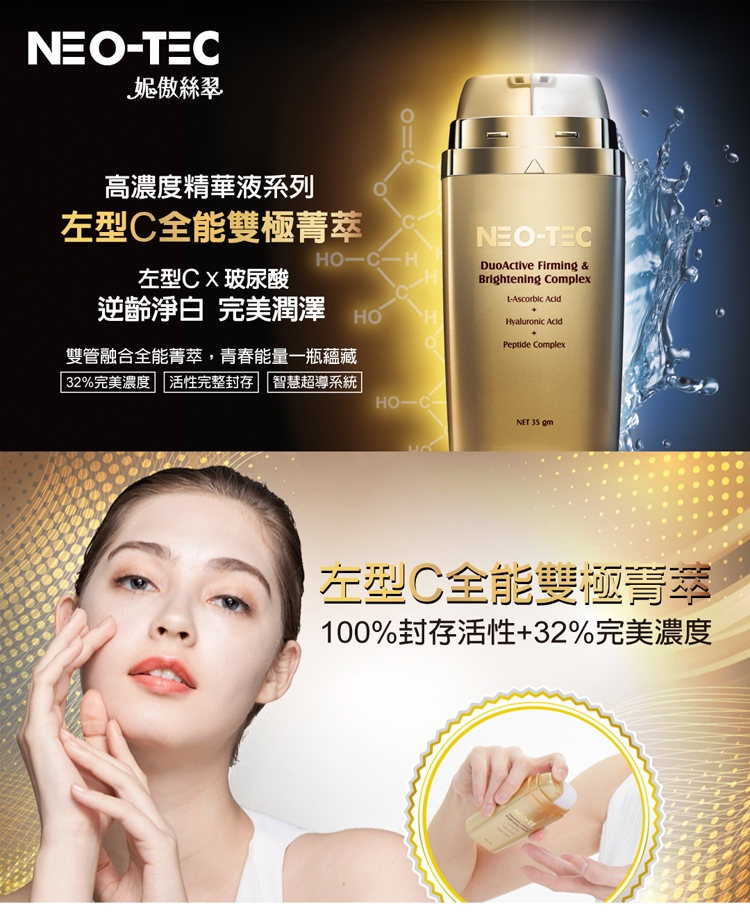 - 創新世代左型維他命C具32%完美濃度,活性完整封存,雙管融合全能菁萃直達肌底,實現深度抗皺、全面緊緻、迅速淨白功效。