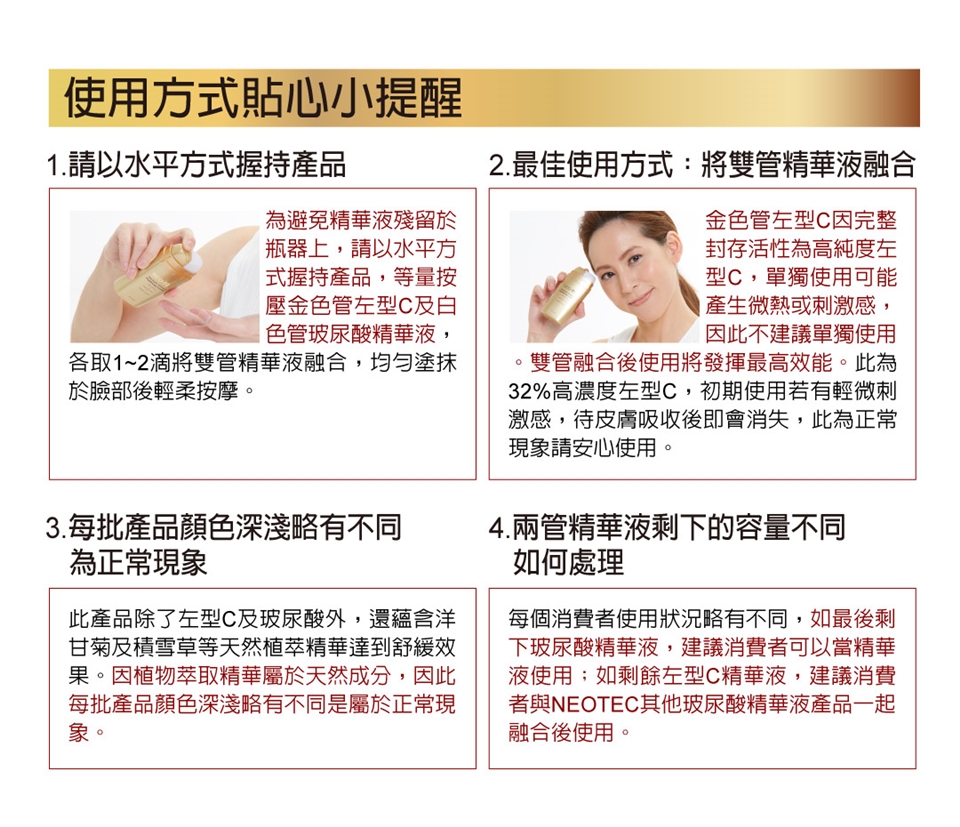 為避免精華液殘留於瓶器上,請以水平方式握持產品,等量按壓金色管內之左型維他命C及白色管內之玻尿酸精華液。