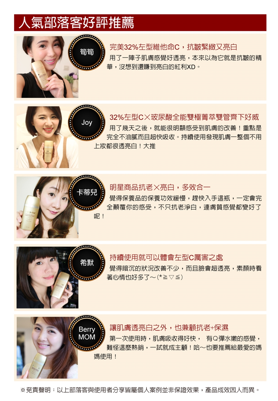 主成分:左型維他命C、玻尿酸鈉、玻尿酸胜肽、二胜肽-10、四胜肽-7、洋甘菊/積雪草/甘草/白茶/虎杖/迷迭香/黃岑萃取精華。