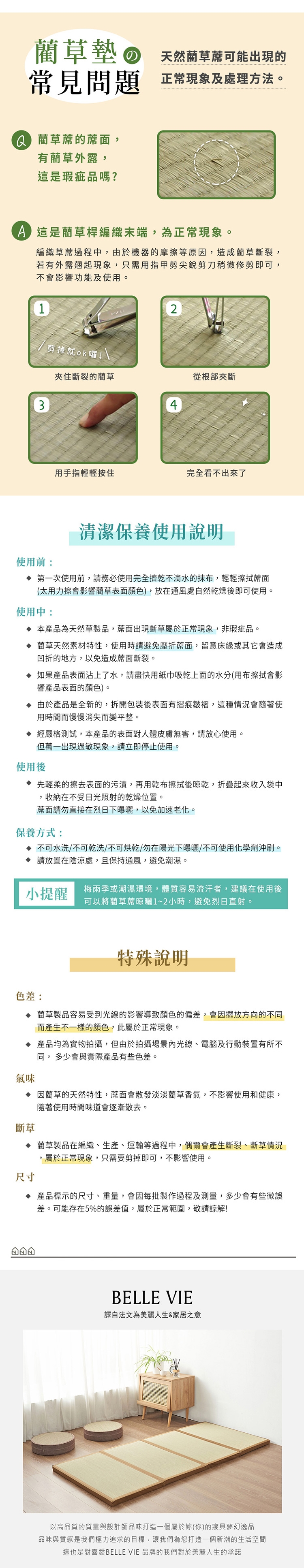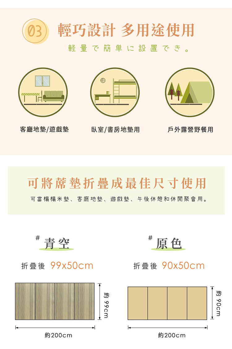 採用天然藺草精緻編制,透氣排汗、調解溫度、涼而不冰冷、觸感極佳,搭配淡淡藺草香氣,柔和舒適,實在超清爽~