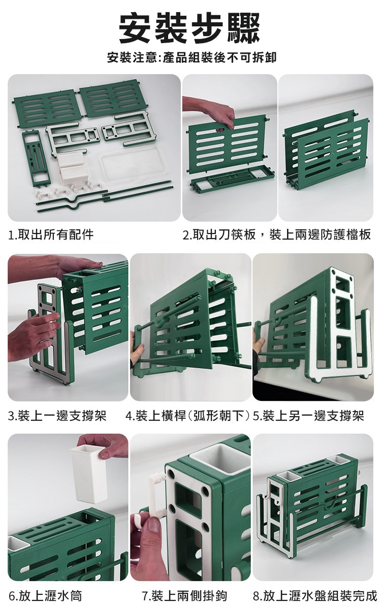 內容物:刀筷板x1、防護擋板x2、支撐架x2、橫桿x2、U型橫桿x2、瀝水桶x2、掛鉤x4、瀝水盤x1