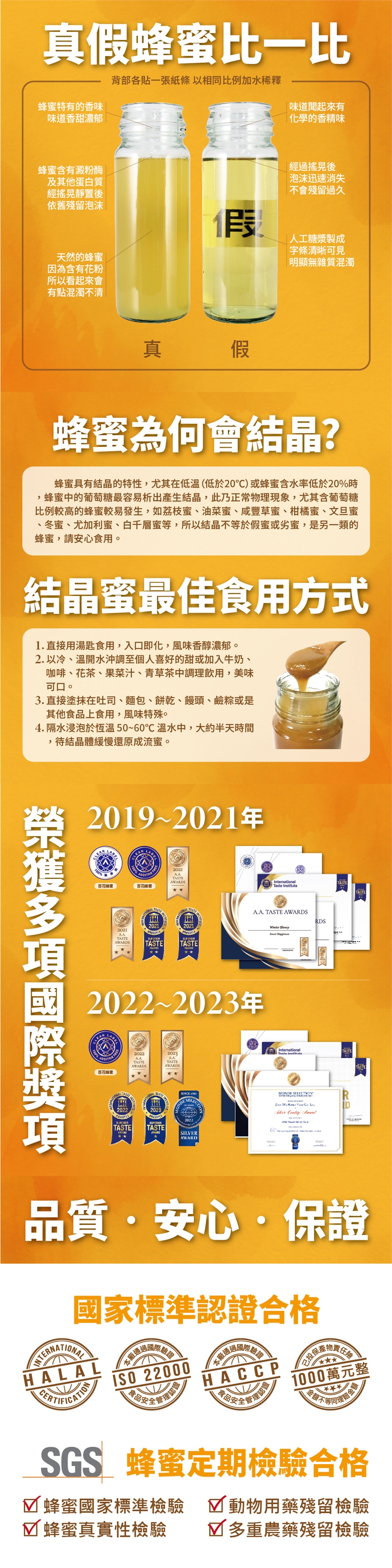 1.蜂蜜含有葡萄糖成分,遇冷或溫差大時易析出產生凝結或沉澱,此現象稱為結晶,屬正常現象。