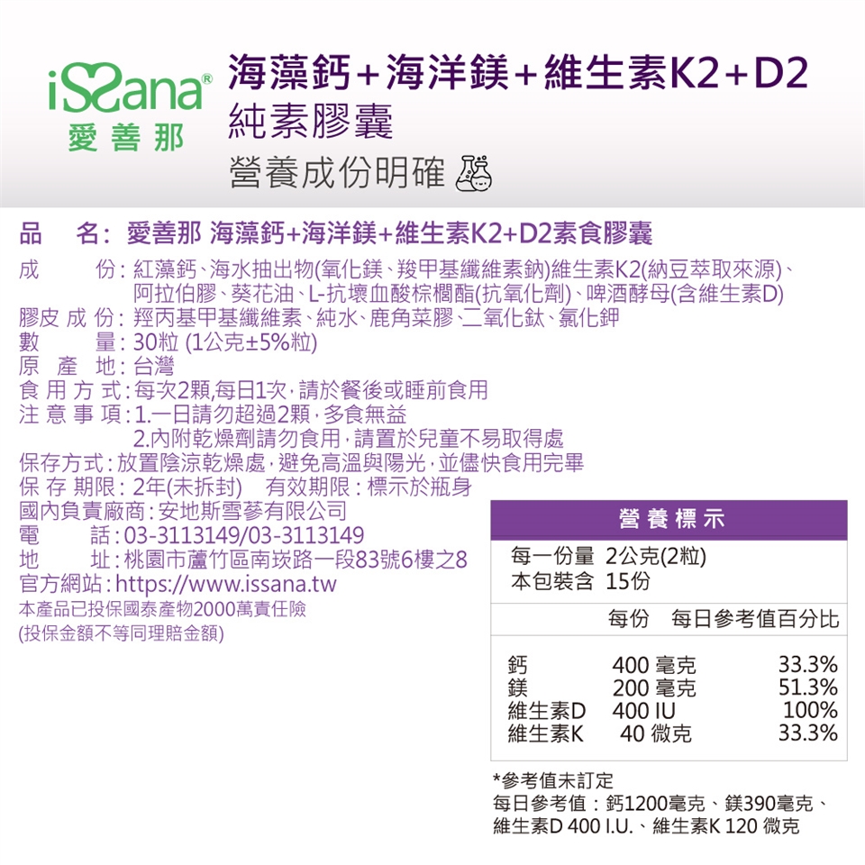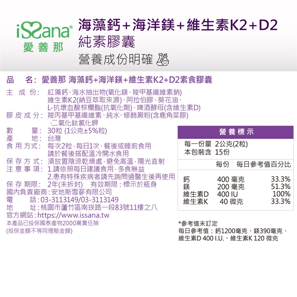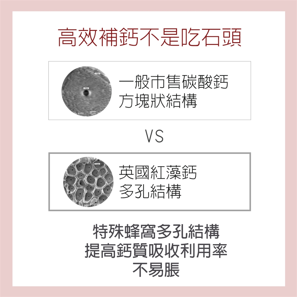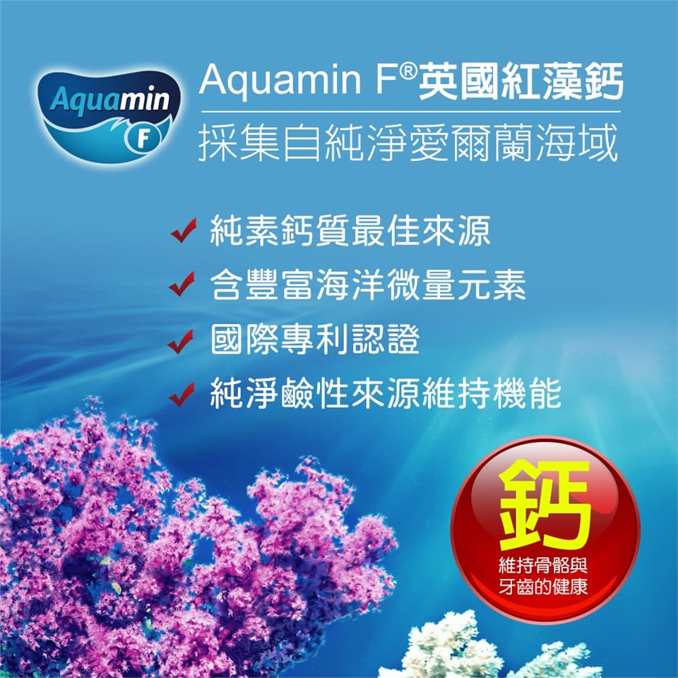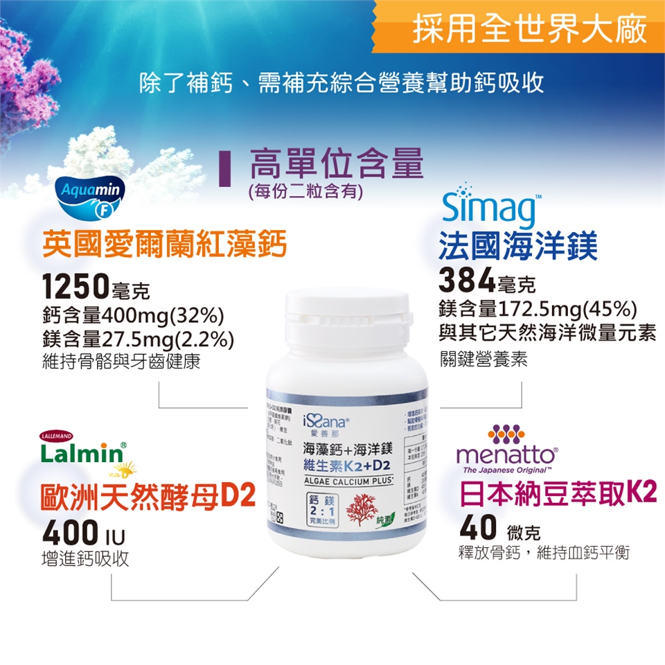 英國Aquamin®全球第一專利有機海洋紅藻鈣,鈣與鎂黃金比例2:1,再添加K2、D2幫助鈣質吸收、轉換。