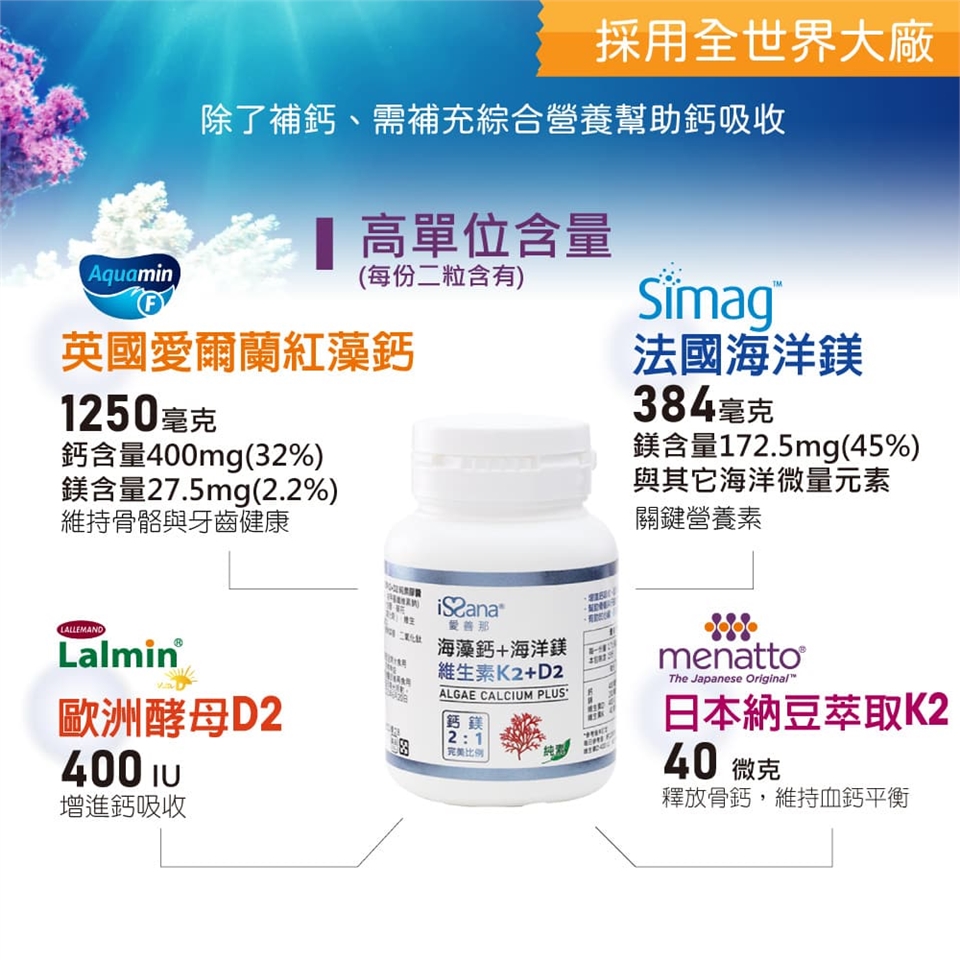 嚴選世界最頂尖大廠保健原料,包含 英國Aquamin®海藻鈣、法國Simag™海水鎂、日本menatt™納豆K2、歐洲lalmin®酵母維生素D2,來源於大自然精華全素配方 ,超過70種以上海洋礦物質元素﹐純淨鹼性食物,不造成身體負擔。