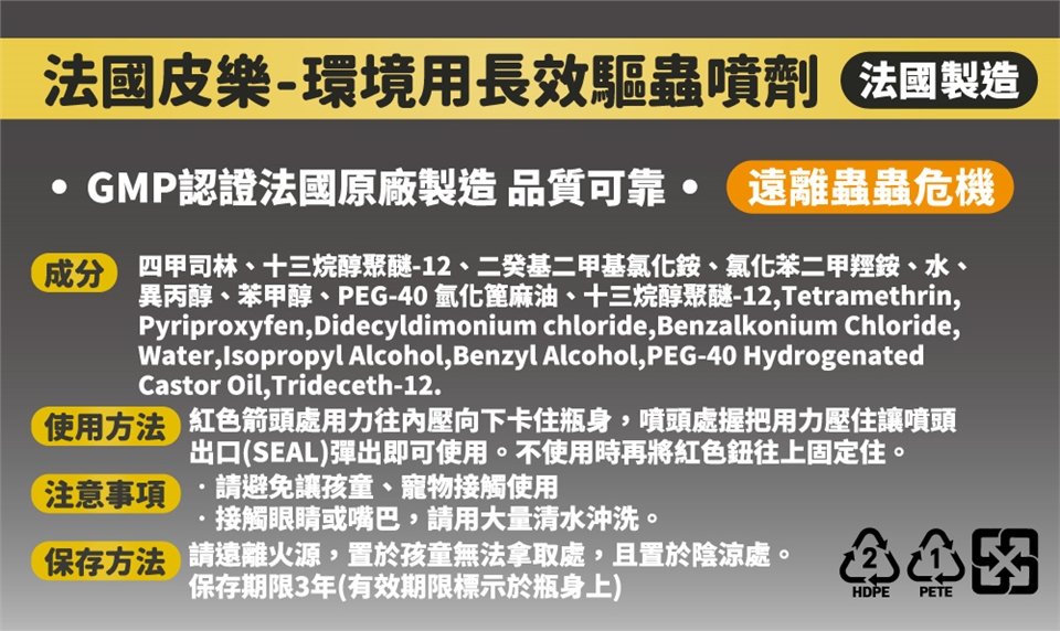 四甲司林、十三烷醇聚醚-12、二癸基二甲基氯化銨、氯化苯二甲羥銨、水、異丙醇、苯甲醇、PEG-40 氫化篦麻油、十三烷醇聚醚-12,Tetramethrin,Pyriproxyfen,Didecyldimonium chloride,Benzalkonium Chloride,Water,Isopropyl Alcohol,