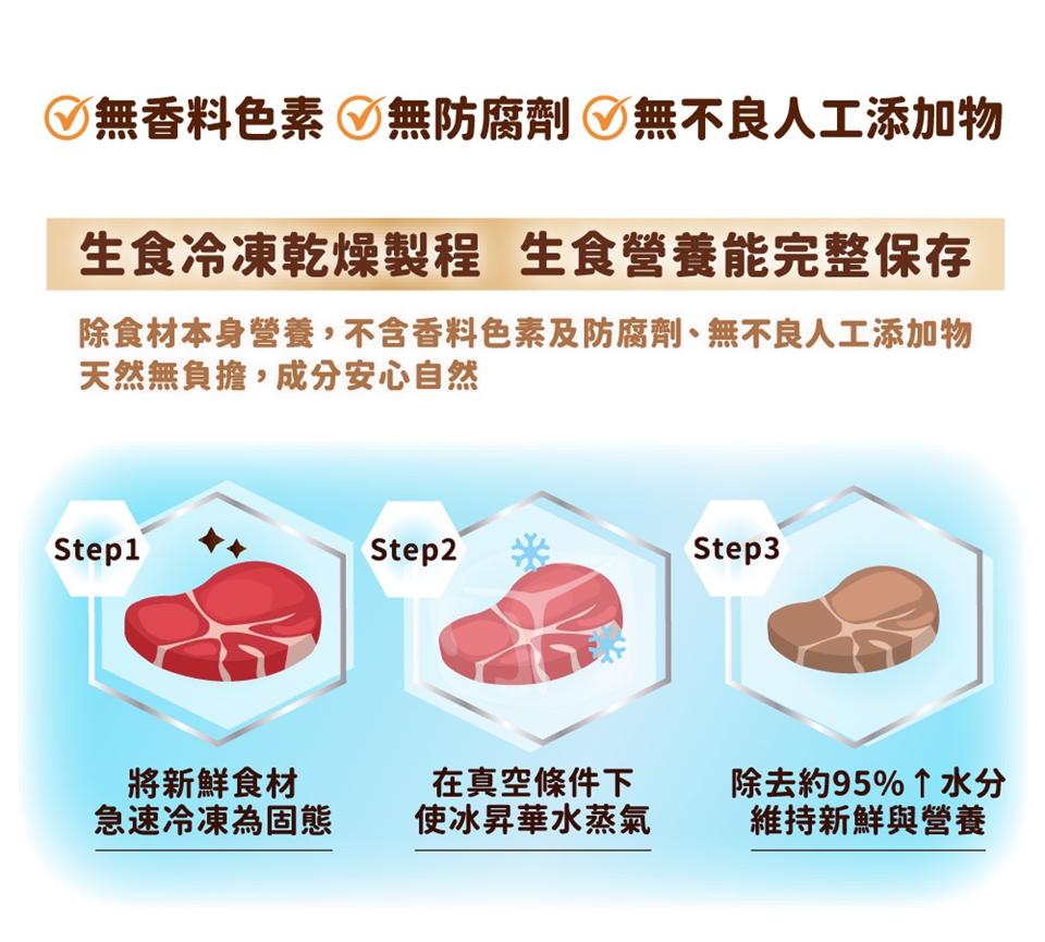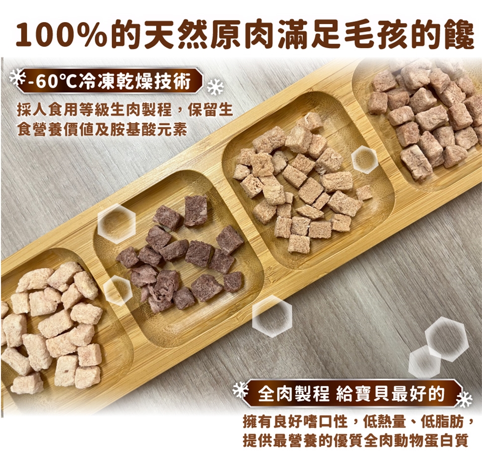 ✔-60℃冷凍乾燥技術|採人食用等級生肉製程,保留生食營養價值及胺基酸元素