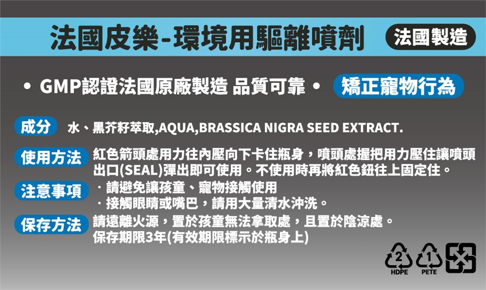 1.此噴劑配方含會刺激貓狗嗅覺及味覺的氣味,可幫助糾正不必要行為;啃咬、破壞、亂大小便等