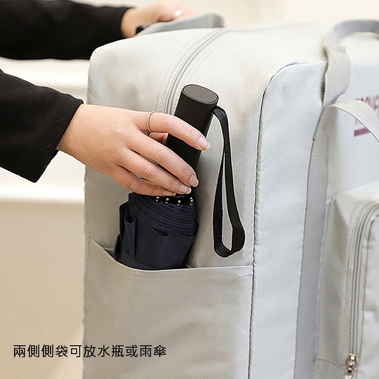 ◎主袋內可放衣物、毛巾等,主袋外前面有一拉鍊袋,可放隨身小物,內有1個小拉鍊袋,可放錢包、手機等物品;兩側側袋可放水瓶或雨傘,多隔袋,可依需求分類放置衣物