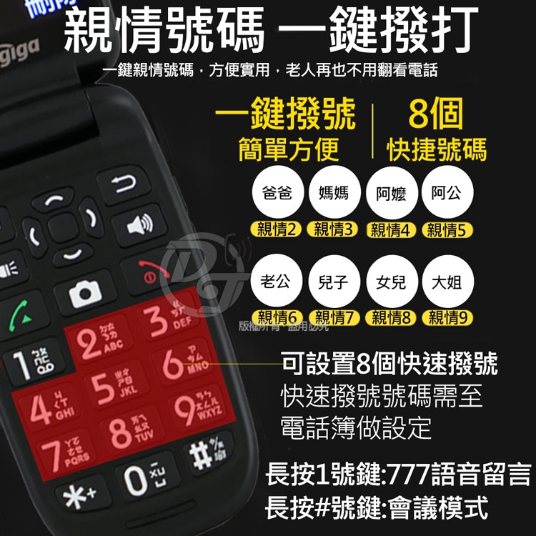 具有8組速撥按鍵,記憶後可快速撥號,讓長輩輕鬆撥打電話