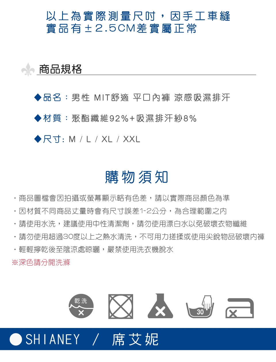 請使用水洗,建議使用中性清潔劑,請勿使用漂白水以免破壞衣物纖維,請勿使用超過30度以上之熱水清洗,不可用力搓揉或使用尖銳物品破壞衣物,輕輕擰乾後至陰涼處晾曬,嚴禁使用洗衣機脫水,深色與淺色請分開洗滌,不可絞扭、不可漂白、不可熨燙、不可乾洗。