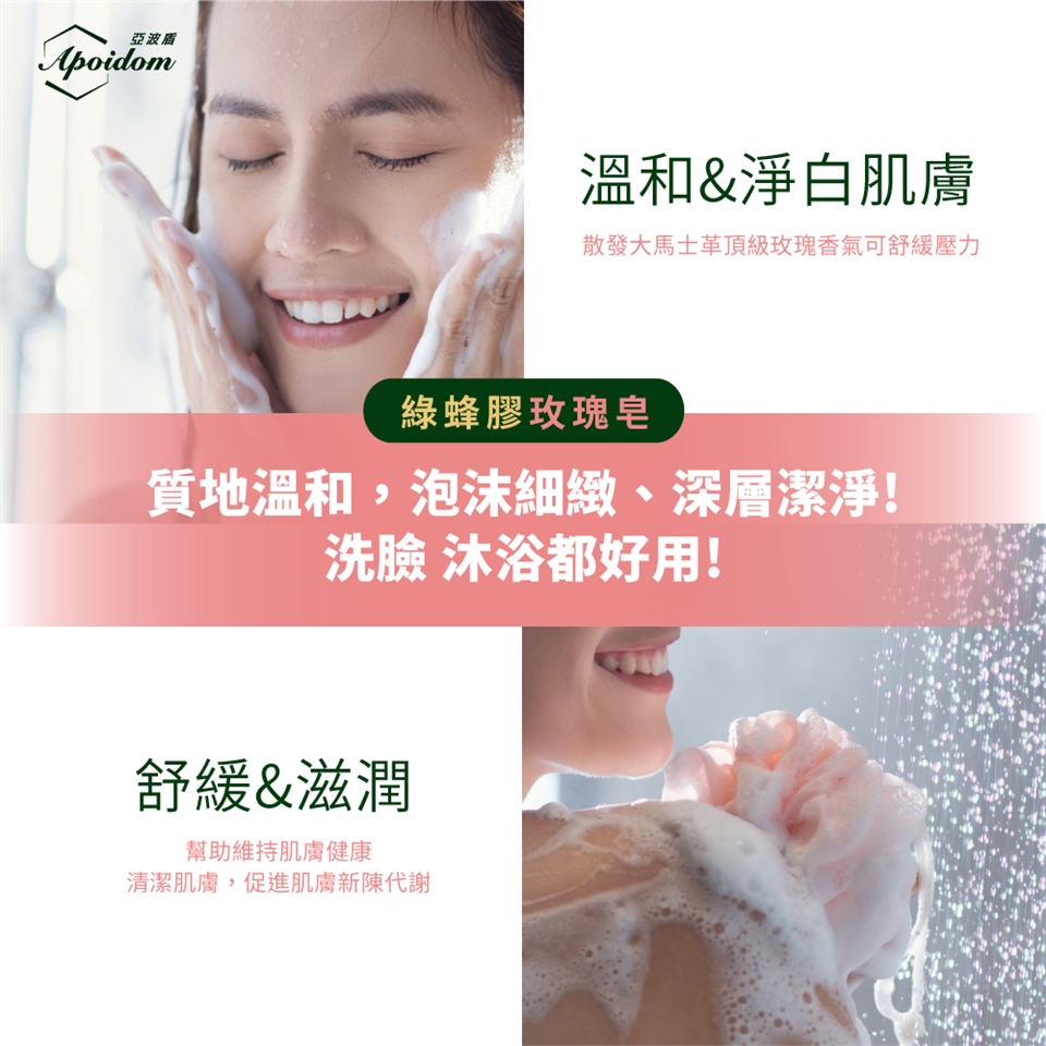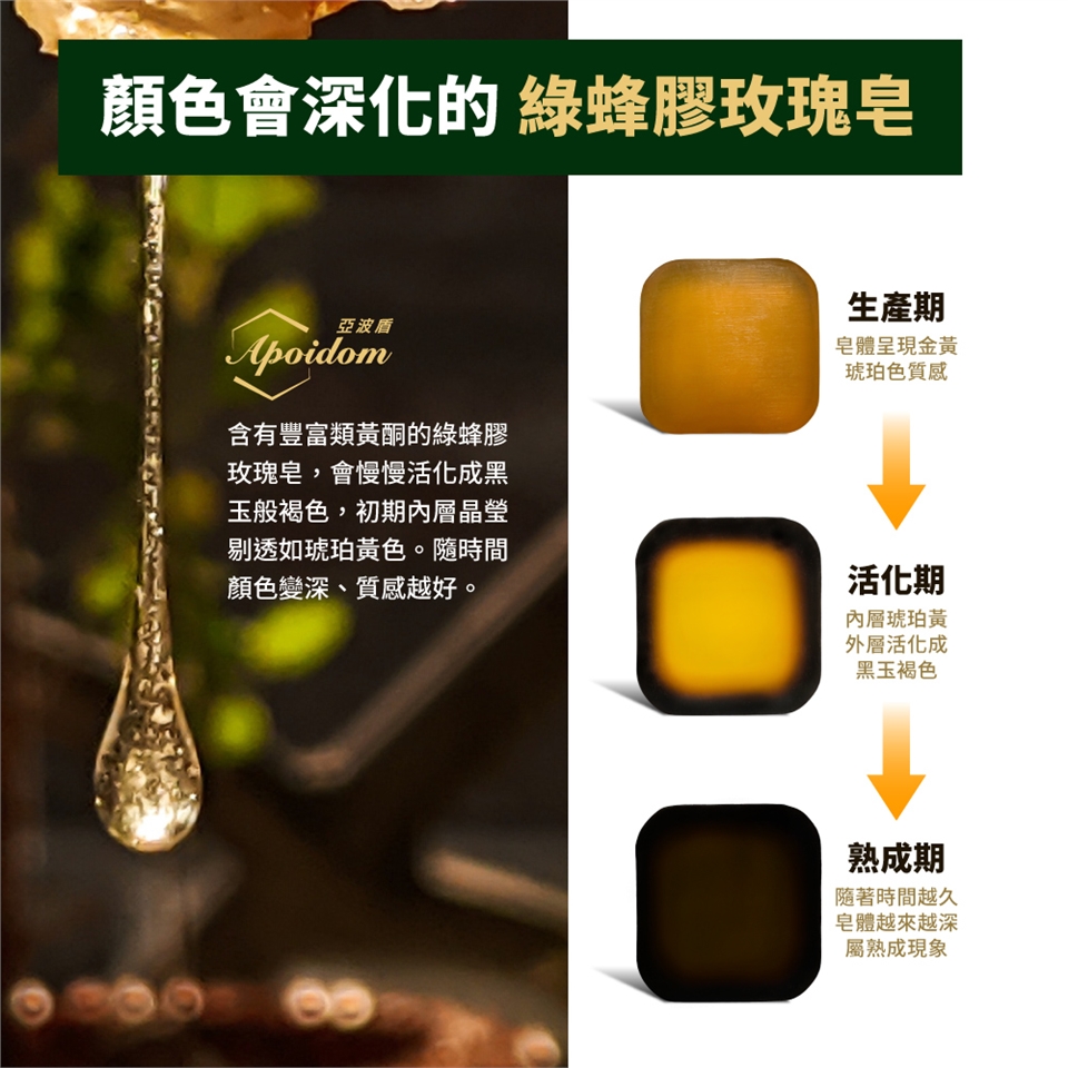 採用台灣特有綠蜂膠萃取,含有豐富的類黃酮成份,並添加淡雅的大馬士革玫瑰原精,融入天然椰子精華中皂化而成的基底,質地溫和,泡沫細緻、深層潔淨。
