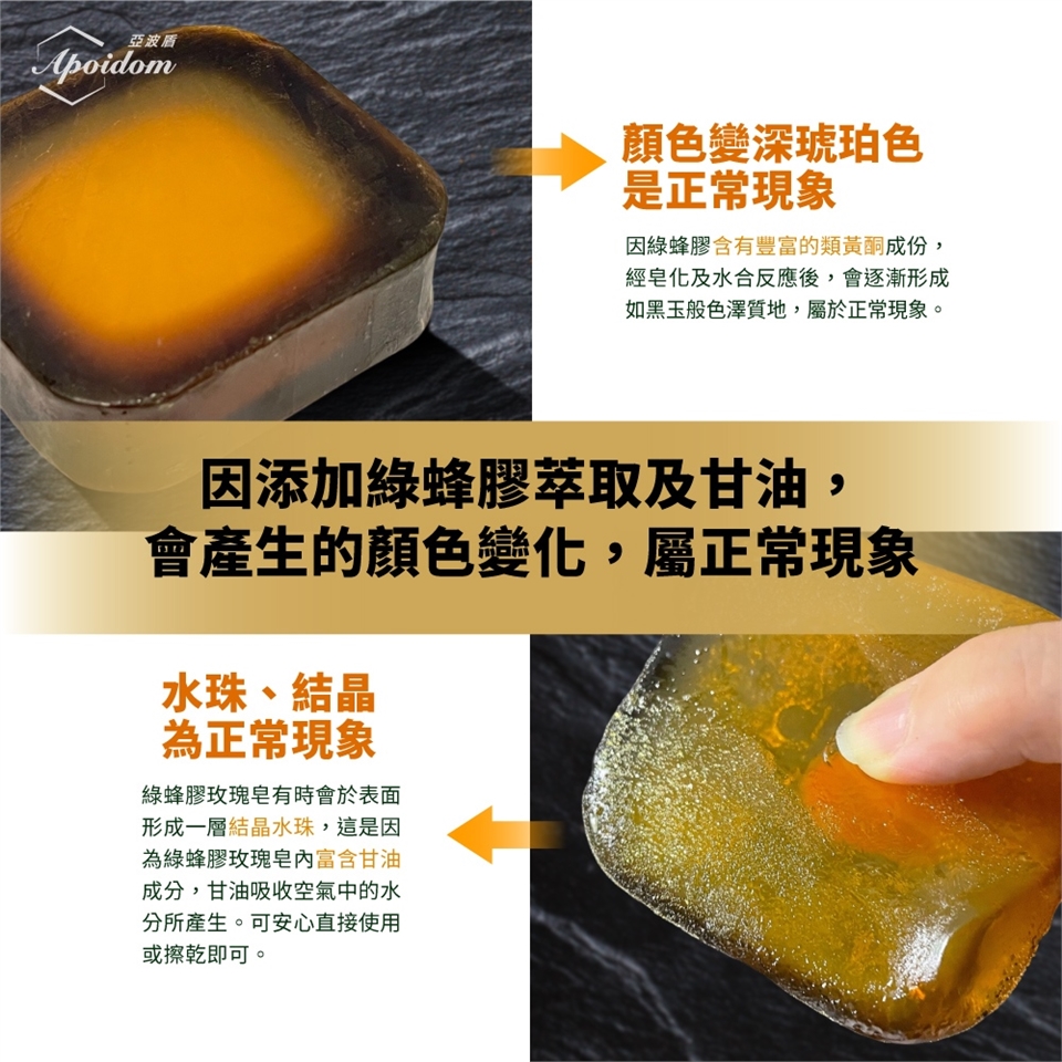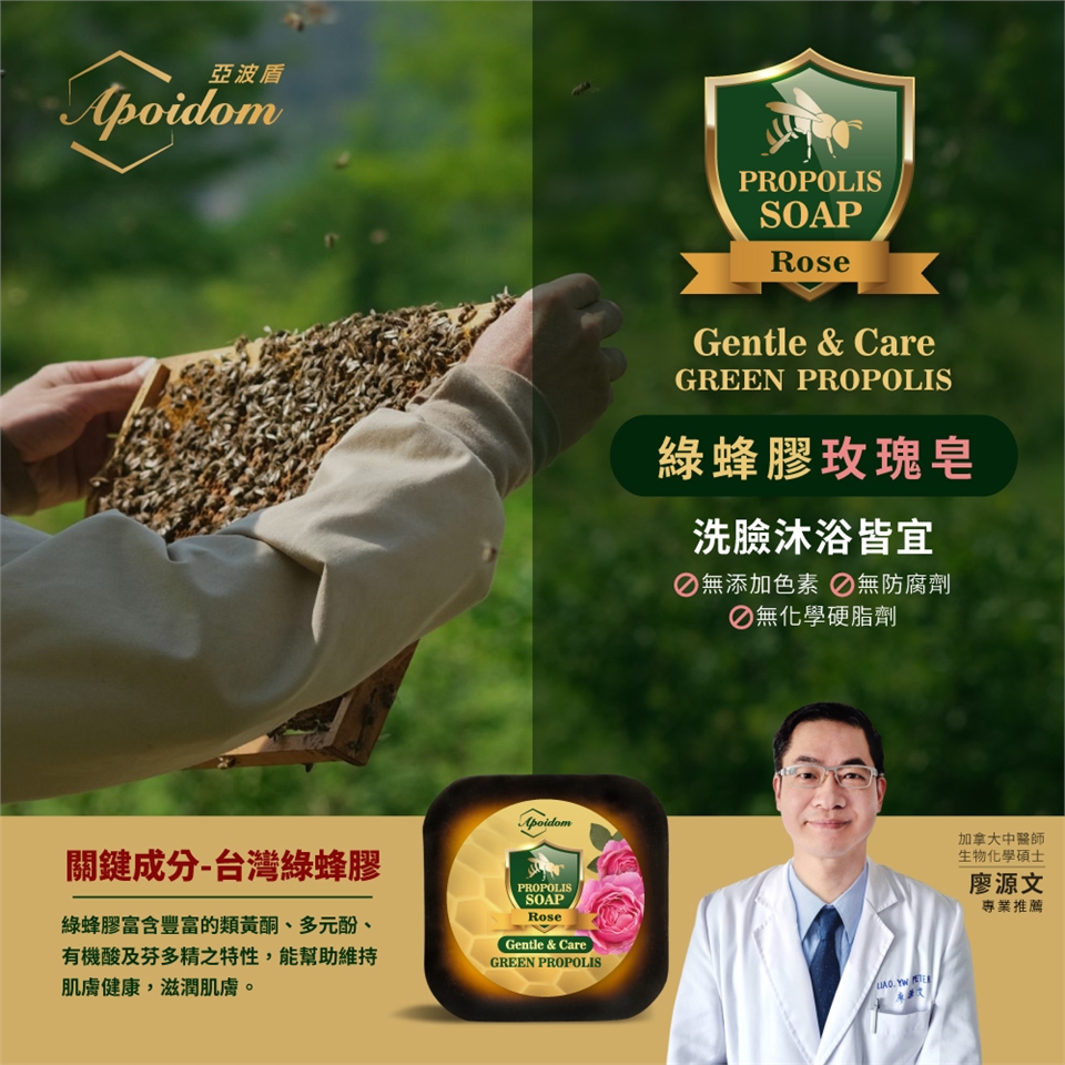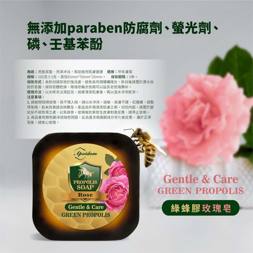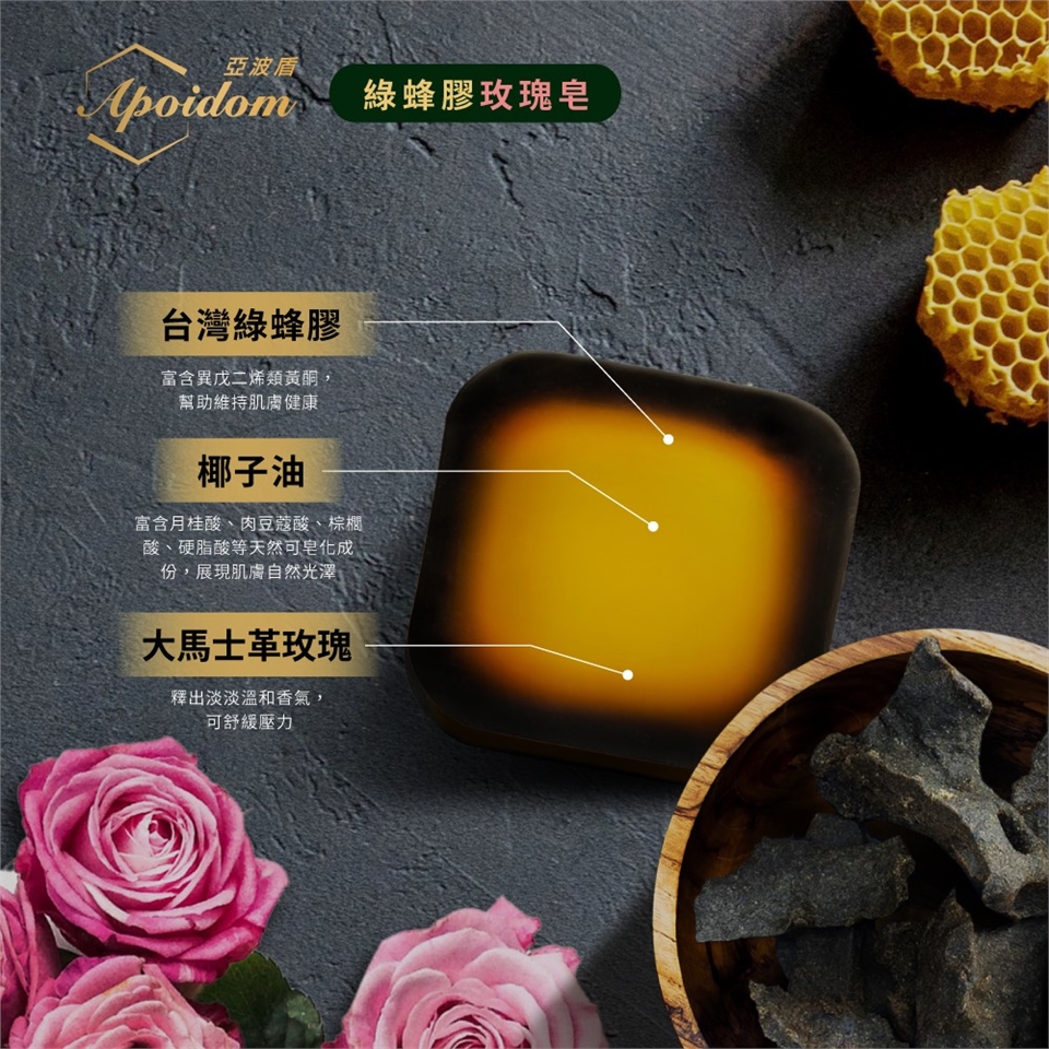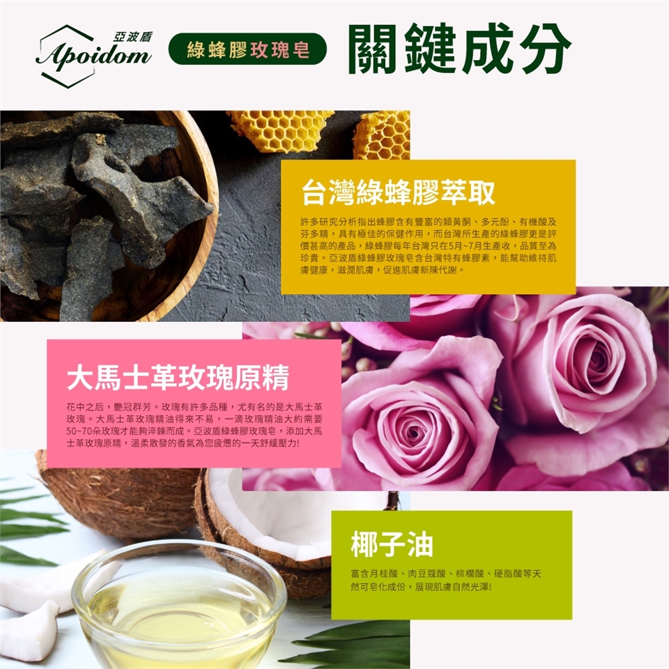 成份:台灣綠蜂膠萃取、玫瑰原精、丙二醇、甘油、糖、米糠油、月桂酸、肉豆蔻酸、棕櫚酸、硬脂酸、氫氧化鈉、碳酸氫鈉、乙二氨四醋酸四鈉