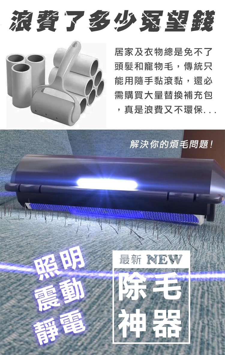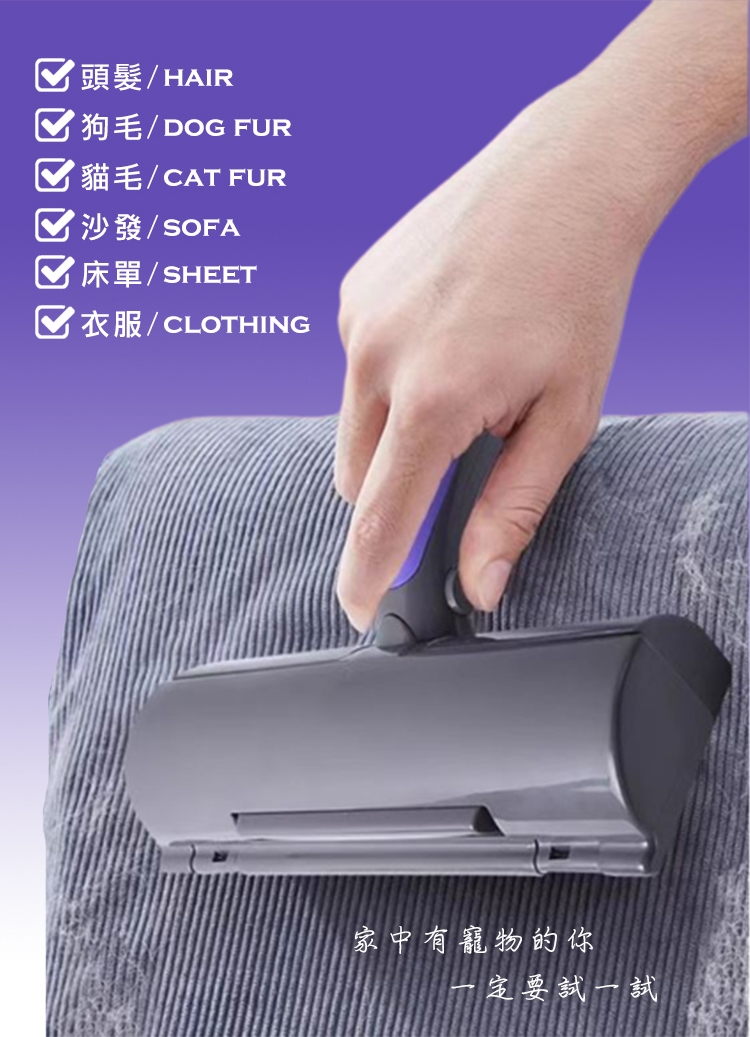 微震動靜電LED滾筒除毛刷,歐美熱銷佳評如潮,有效清除寵物掉毛,適合家裡有養寵物的您。照明、震動、靜電吸附除毛神器,獨特雙向刷毛設計,來回刷即可產生靜電,吸附毛髮輕鬆帶入集毛倉;一鍵彈開集毛倉,大開口輕鬆倒毛;LED照明不漏毛髮,角落也不放過,輕鬆打造衛生整潔的居家環境。
