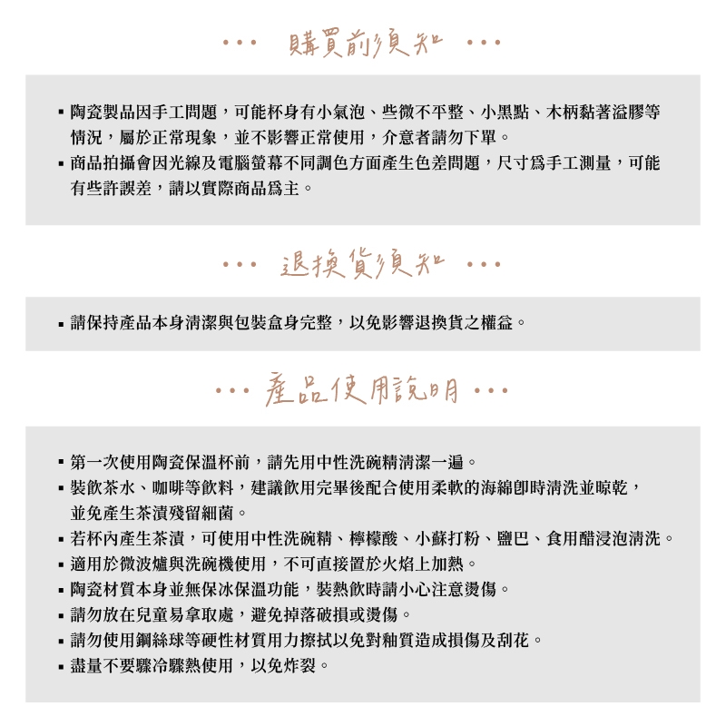 ●陶瓷材質本身並無保冰保溫功能,裝熱飲時請小心注意燙傷。