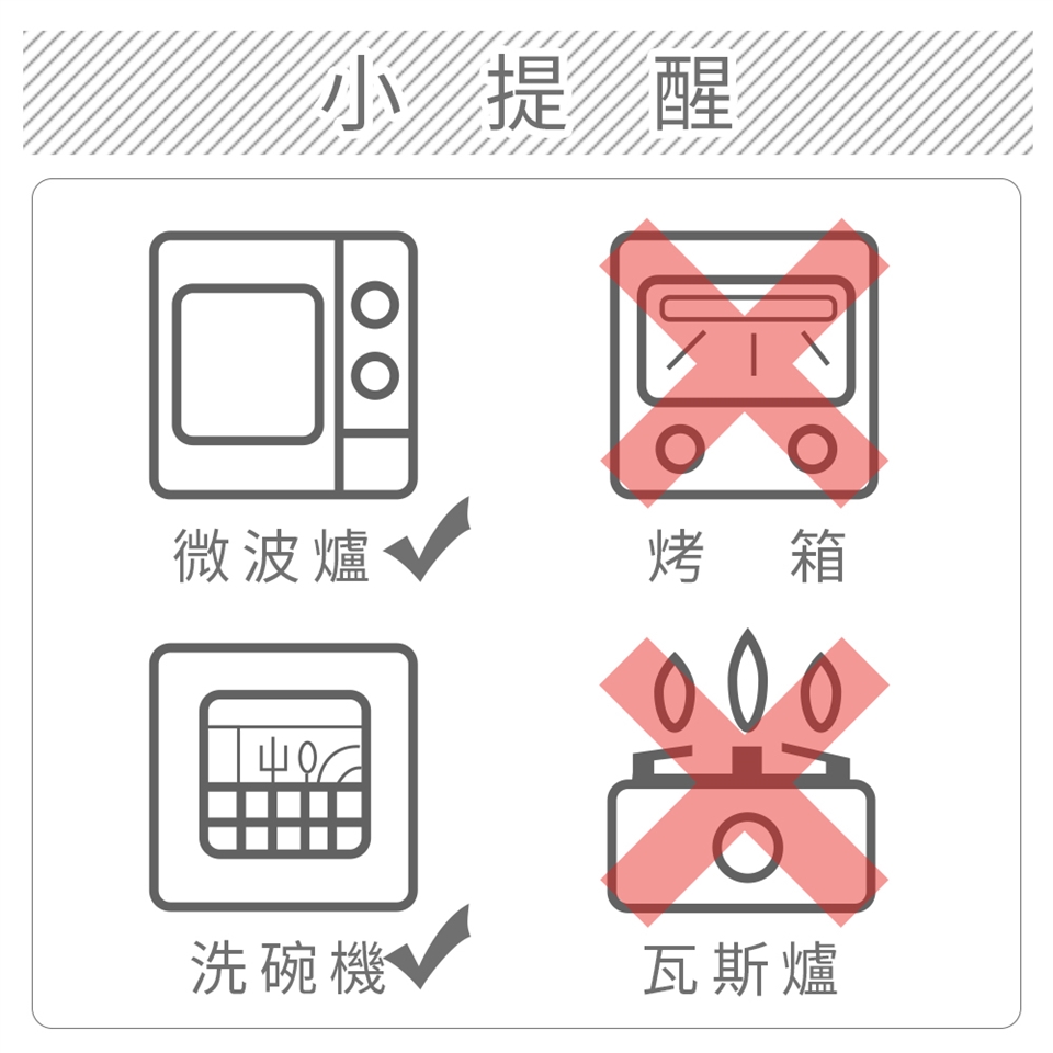 ●適用於微波爐與洗碗機使用,不可直接置於火焰上加熱。