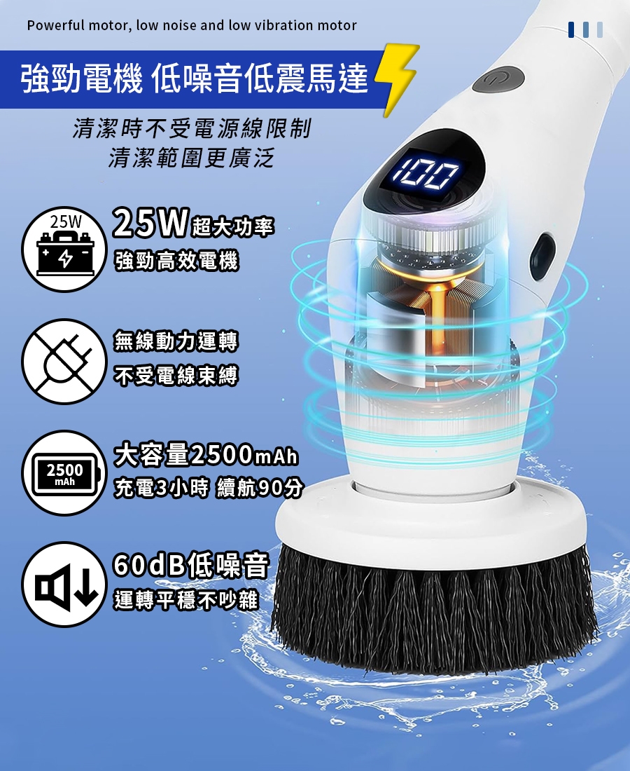 附贈8個大刷頭、贈長/短手柄,贈收納繩、贈收納袋、贈抹布、贈充電線