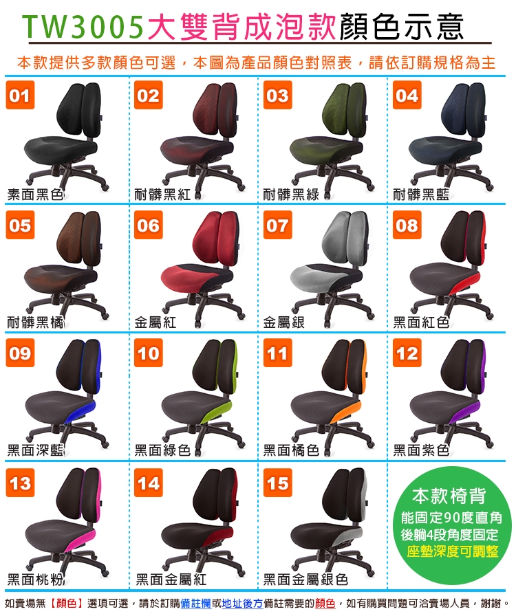 椅背可固定90度或彈力後仰式,多款造型、多功能扶手可選,