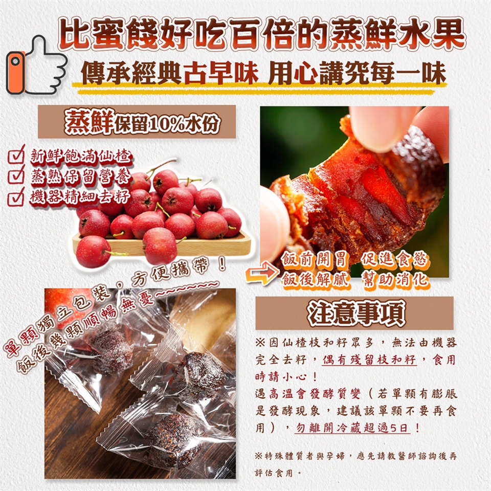 因仙楂枝和籽眾多,無法由機器完全去籽,偶有殘留枝和籽,食用時請小心!