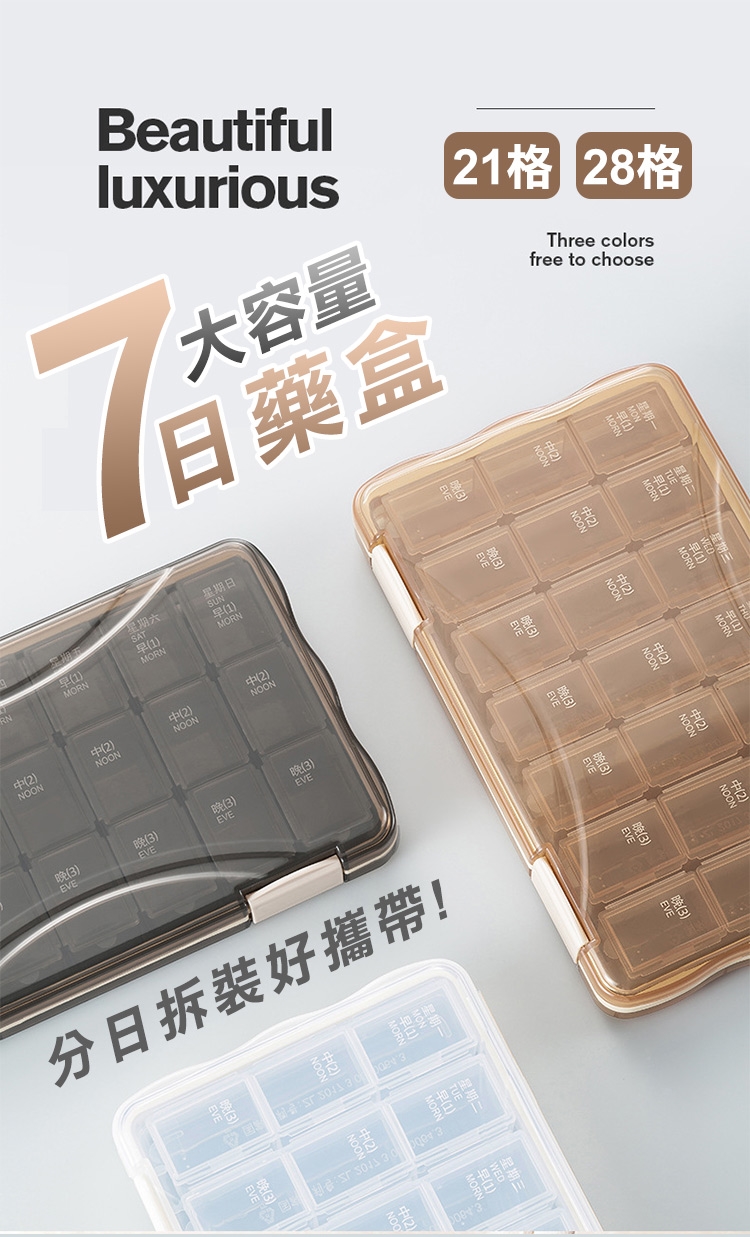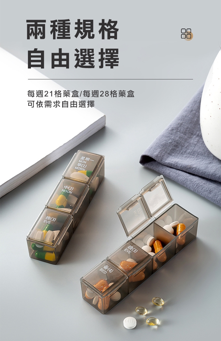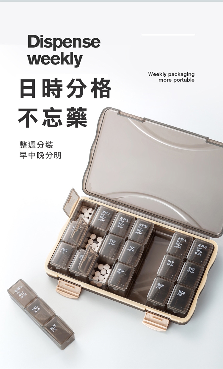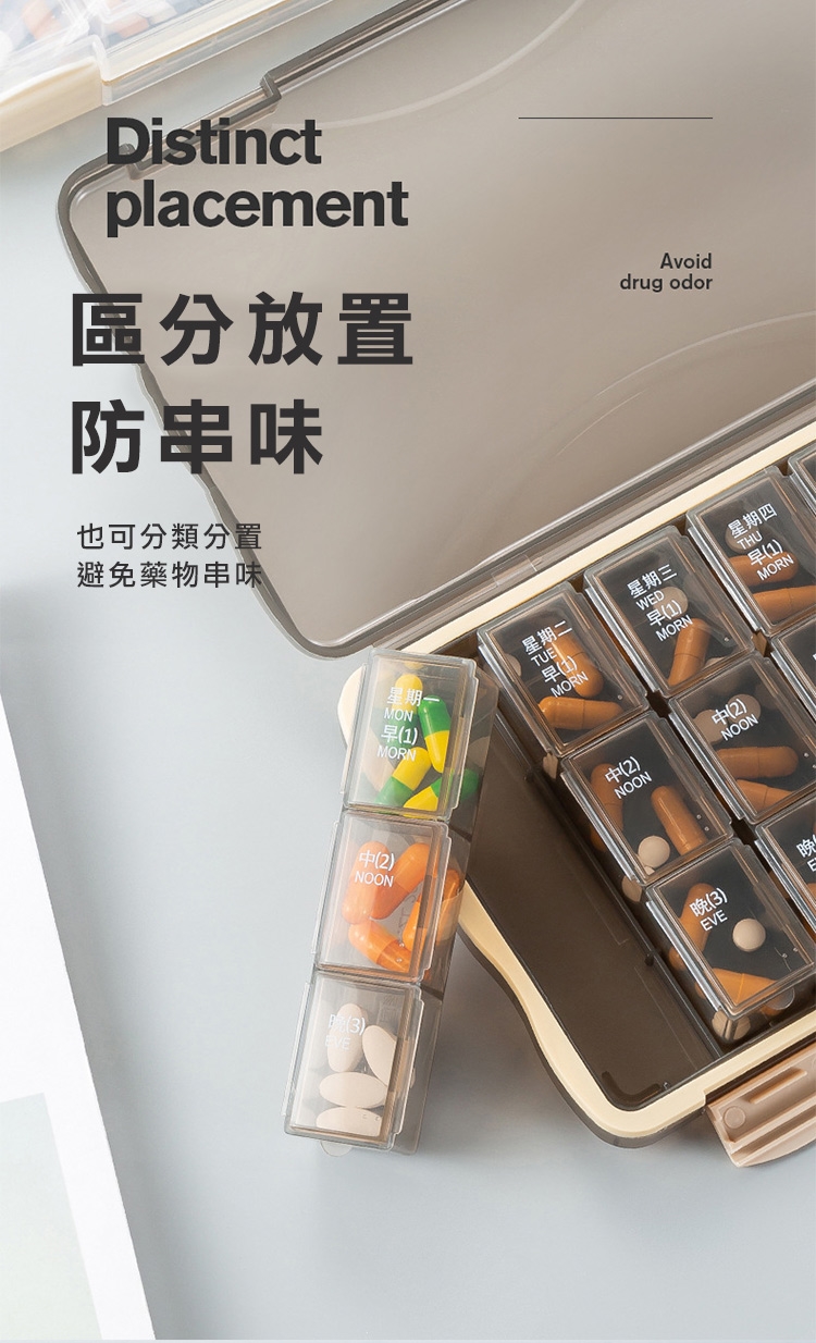 常常忘記吃藥或者找不到藥物嗎?出門帶一整包藥物好麻煩...便攜可拆裝衛生密封七日藥盒,大容量可裝七日份,可拆裝出門只需帶一條內盒,便利好攜帶,分格印刷早、中、晚+(備註),最適合長輩時常忘記有沒有吃藥了,食品級用PP材質,防潮矽膠密封條水,每格區格分明,分裝不變質,讓吃藥變得更簡單更有效率!還你一個健康身體~