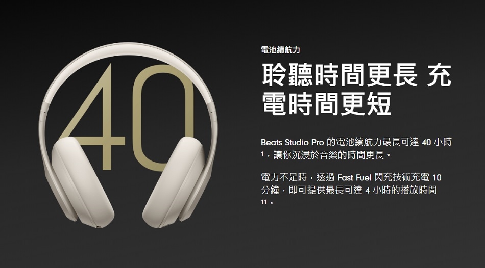 8. 測試由 Apple 於 2023 年 5 月使用預量產的 Beats Studio Pro 裝置和軟體,搭配 iPhone 13 機型和測試版軟體進行。播放列表包括 358 首購於 iTunes Store 的不同曲目 (256-Kbps AAC 編碼)。音量設定在 50%,主動降噪功能和通透模式為關閉狀態。測試包括於播放音訊時對 Beats Studio Pro 進行完全放電,直至 Beats Studio Pro 停止播放。主動降噪功能開啟時,聆聽時間最長可達 24 小時。電池使用時間視裝置設定、環境、使用情況與許多其他因素而定。