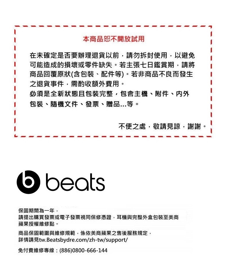 7. 商品保固規範與維修申請依照美商蘋果公司售後服務規定,詳情請見:https://www.beatsbydre.com/tw/support
