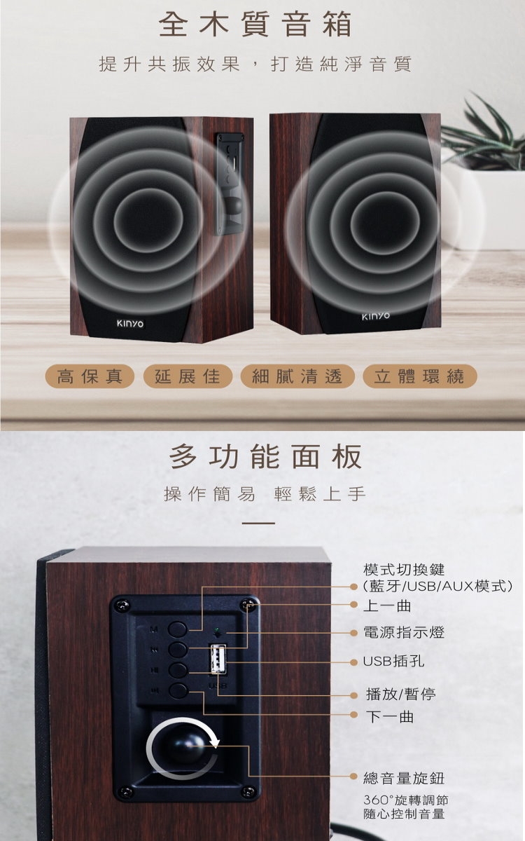 【KINYO】福利品- AC供電二件式木質藍牙多媒體音箱(KY-1077)