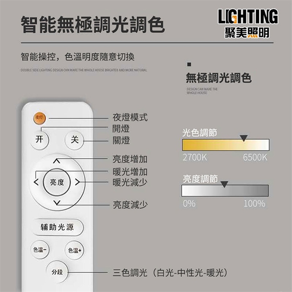 色溫:遙控三色變光無極調光