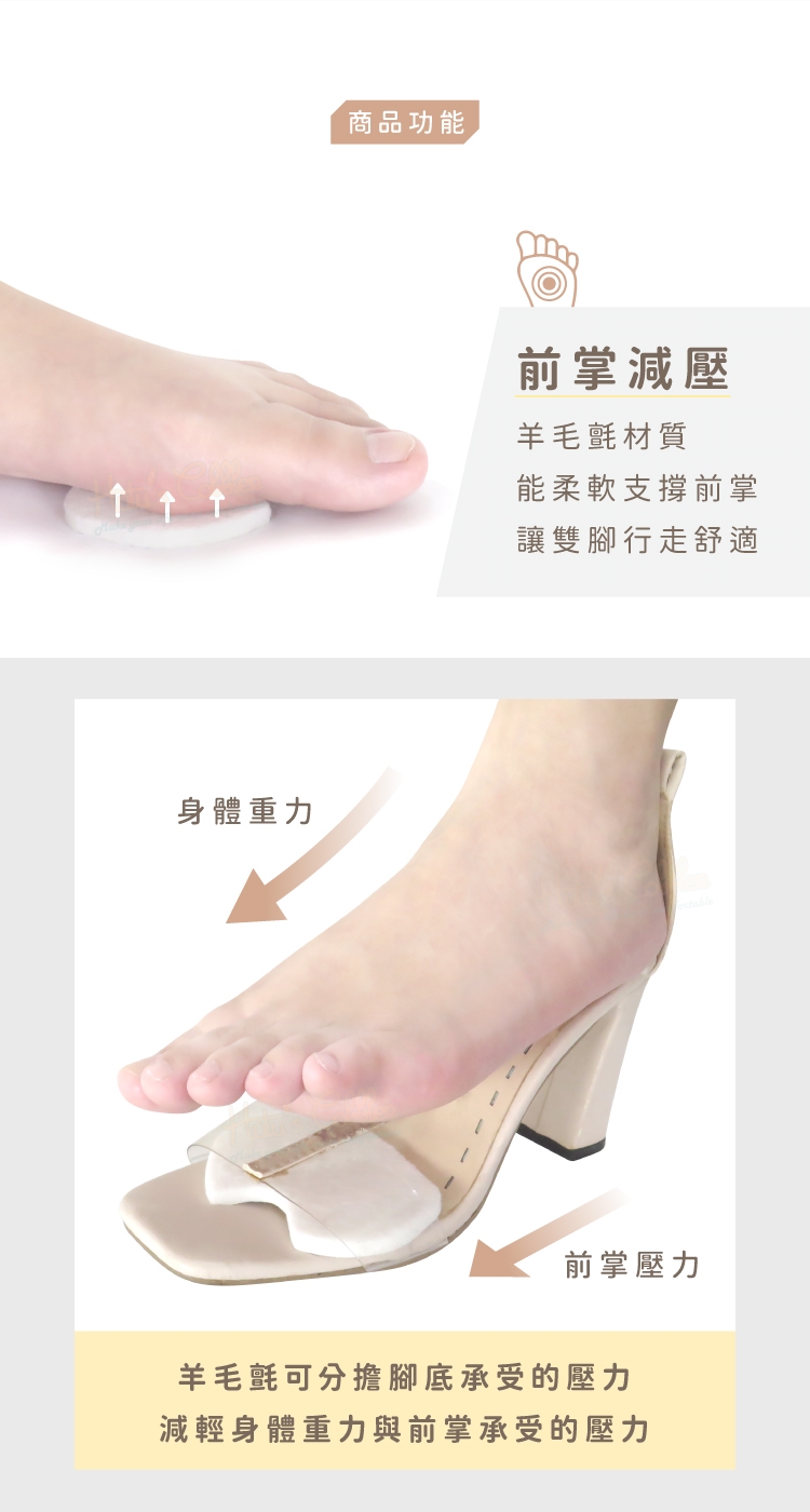 羊毛氈可分擔腳底承受的壓力,減輕身體重力與前掌承受的壓力