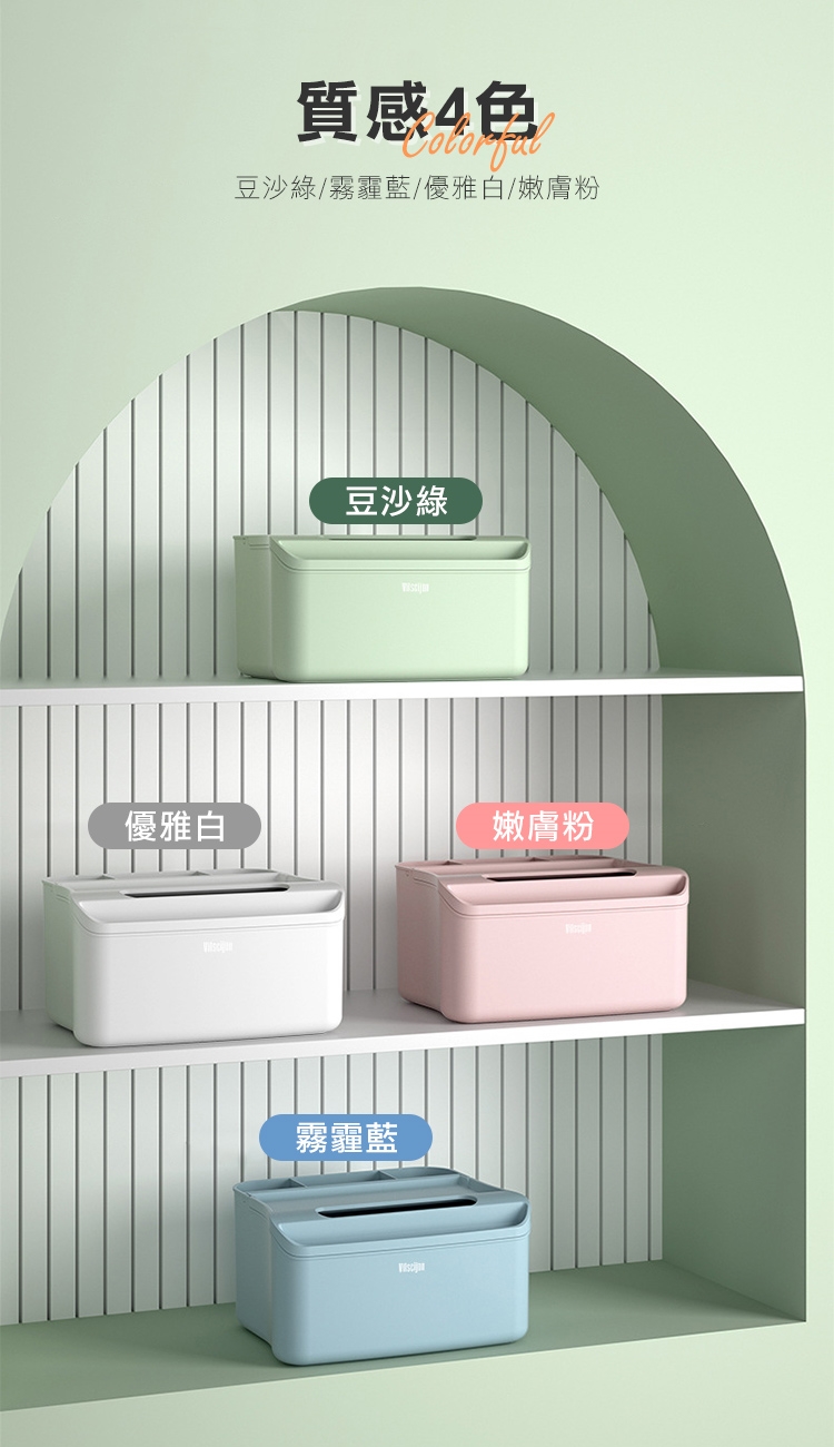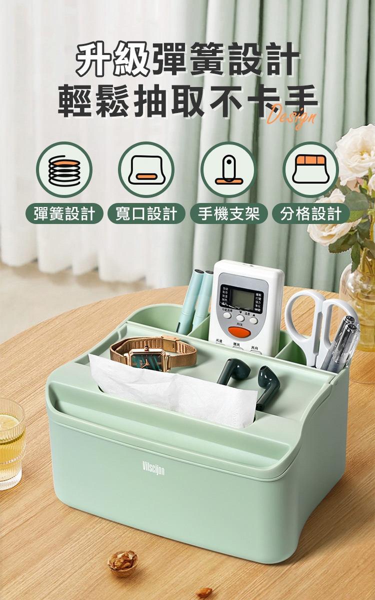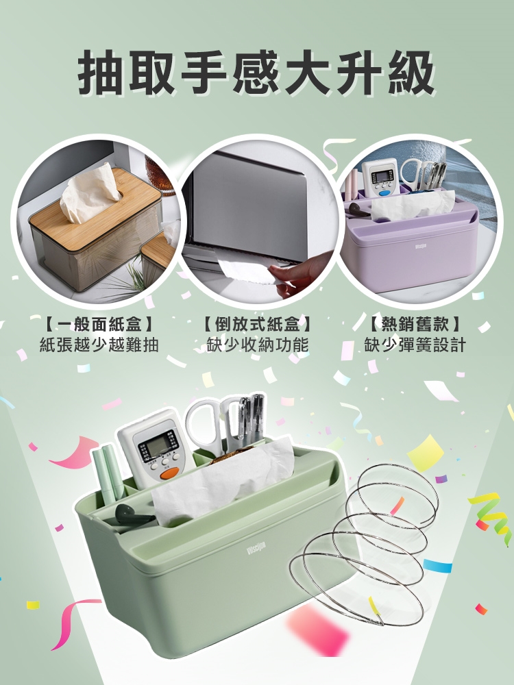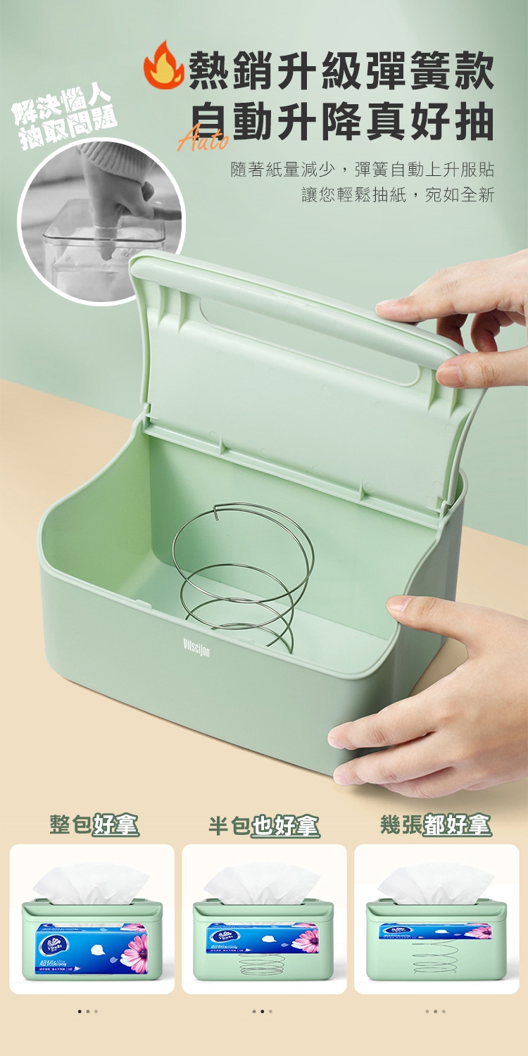 衛生紙越抽越少、越少越難抽取,您還在為此煩惱嗎?來試試這款多功能自動彈升寬口面紙盒,獨家彈升設計,讓您衛生紙從多到少都一樣好抽!內置彈簧自動上推衛生紙,保持在最高位置如全新般好抽。一大兩小收納格一置物平面分區收納,追劇手機支架設計橫豎皆可放,寬口設計好抽取,紙槽位尺寸剛剛好可放各式衛生紙,四色多功能應用您的面紙盒最佳選擇~