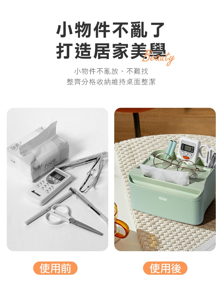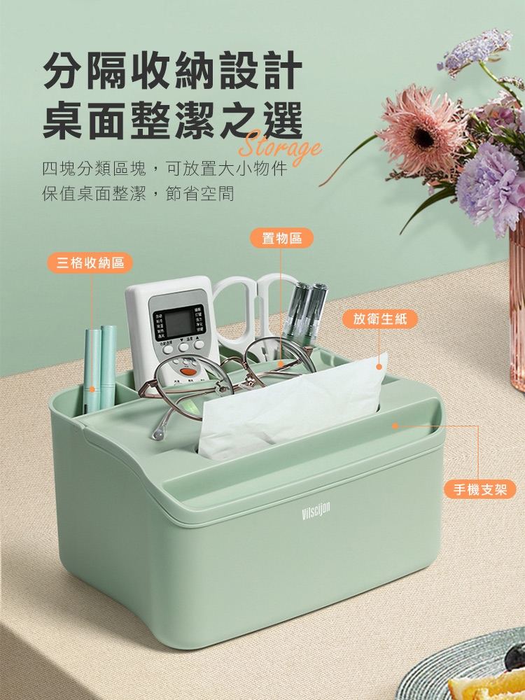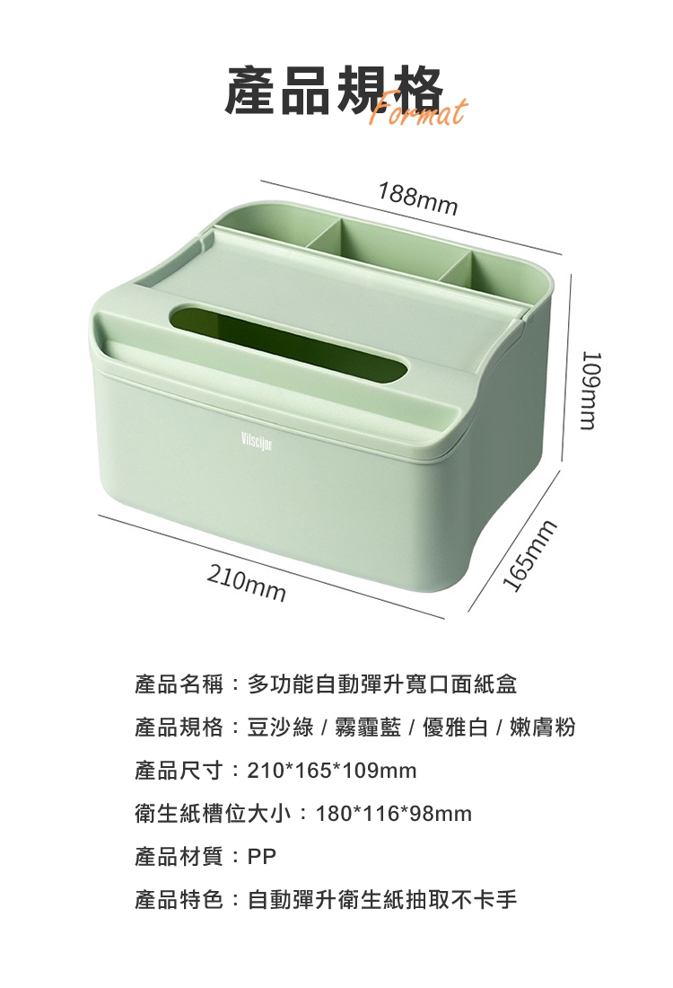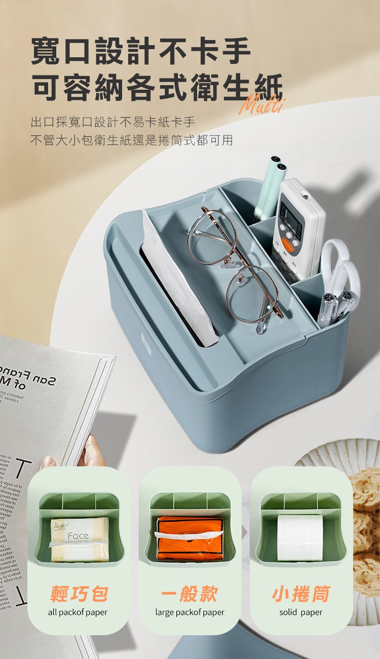 衛生紙越抽越少、越少越難抽取,您還在為此煩惱嗎?來試試這款多功能自動彈升寬口面紙盒,獨家彈升設計,讓您衛生紙從多到少都一樣好抽!內置彈簧自動上推衛生紙,保持在最高位置如全新般好抽。一大兩小收納格一置物平面分區收納,追劇手機支架設計橫豎皆可放,寬口設計好抽取,紙槽位尺寸剛剛好可放各式衛生紙,四色多功能應用您的面紙盒最佳選擇~