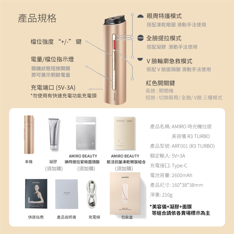 品名:AMIRO 時光機 拉提美容儀 R3 TURBO - 流沙金 + 保濕柔嫩精華凝膠 5入