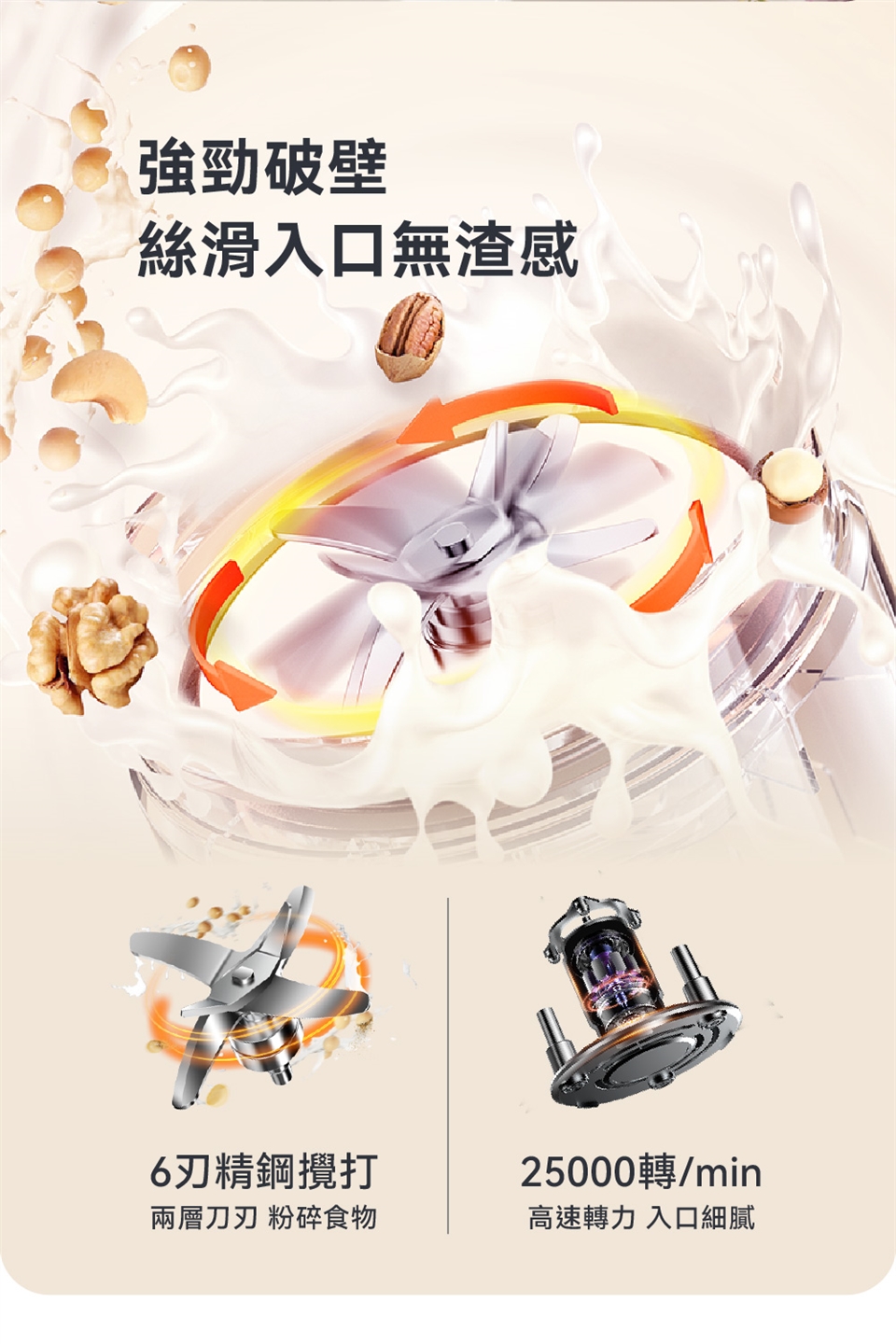 ◆6刃刀頭每分25000轉,強勁破壁,絲滑入口無渣感。