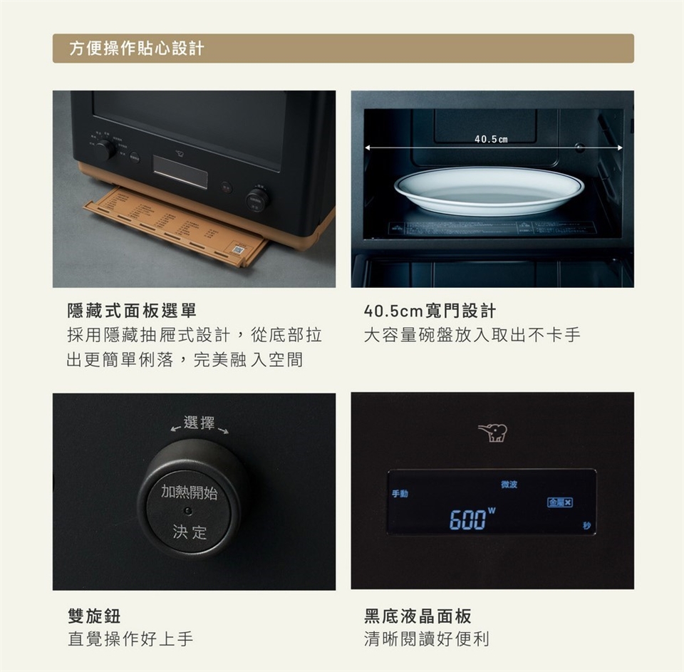 | (10)方便操作貼心設計:隱藏抽屜式選單、40.5cm寬門、雙旋鈕直覺操作、黑底液晶面板。 |