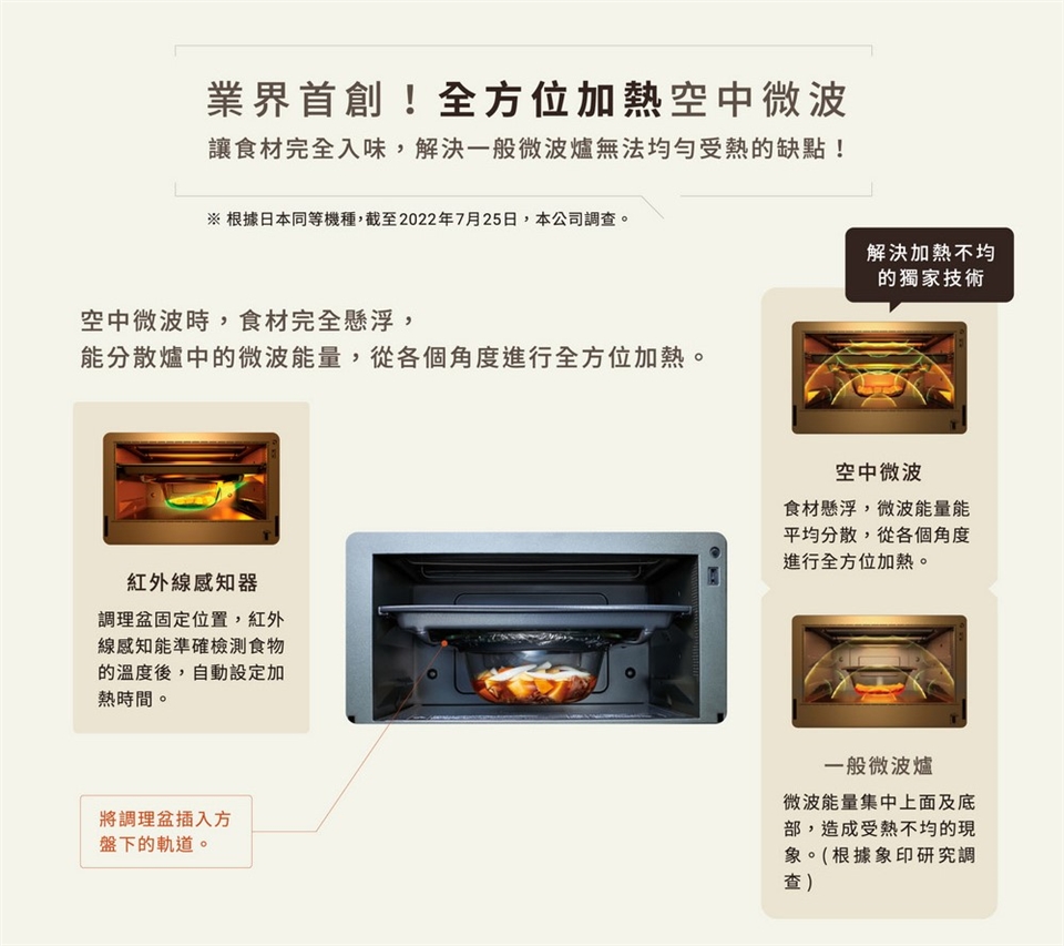 | (1)首創空中微波,食材懸浮從各個角度全方位加熱。 |
