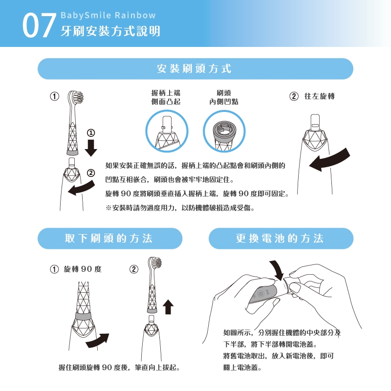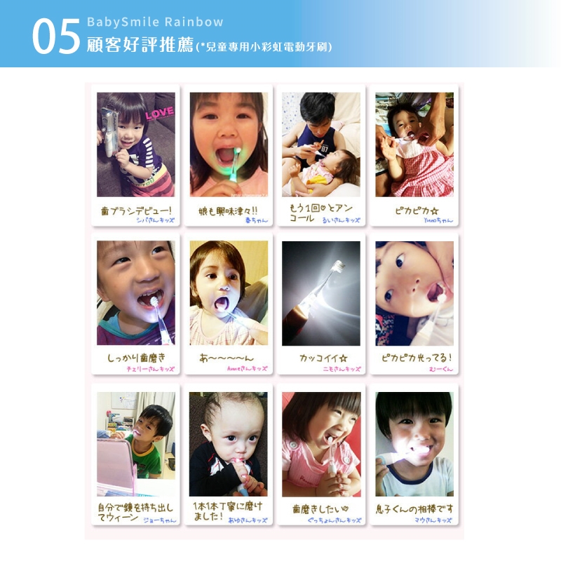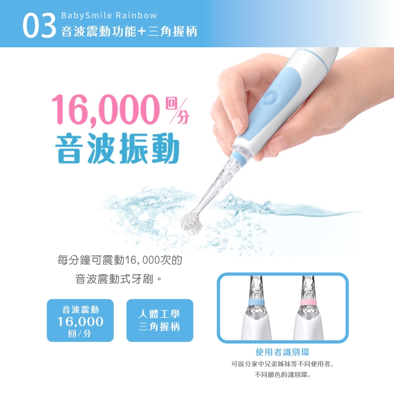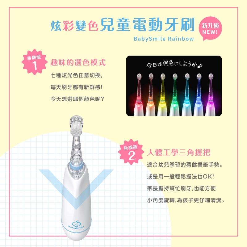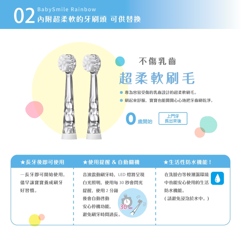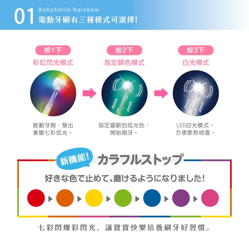 搭配七色彩虹閃光,讓寶寶開開心心地養成刷牙好習慣。