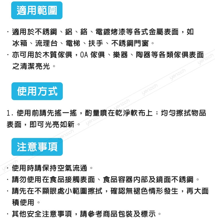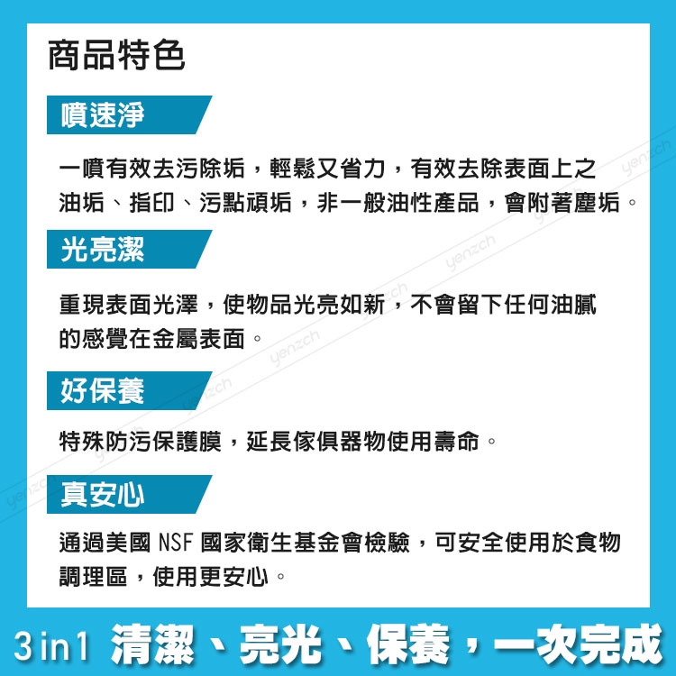 ◆清潔光亮保養一次完成,適用於不鏽鋼表面