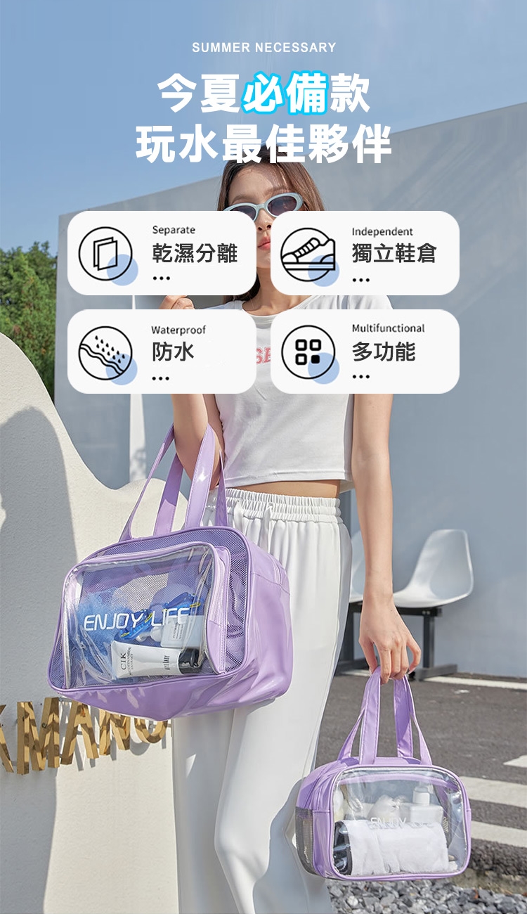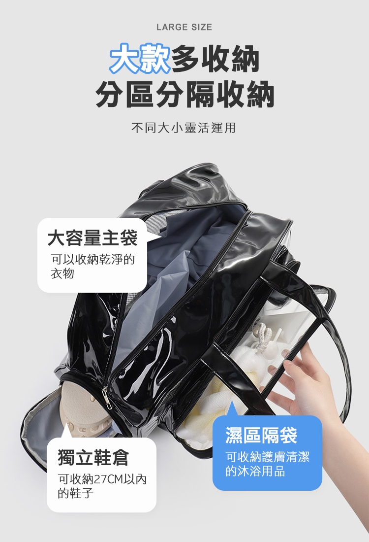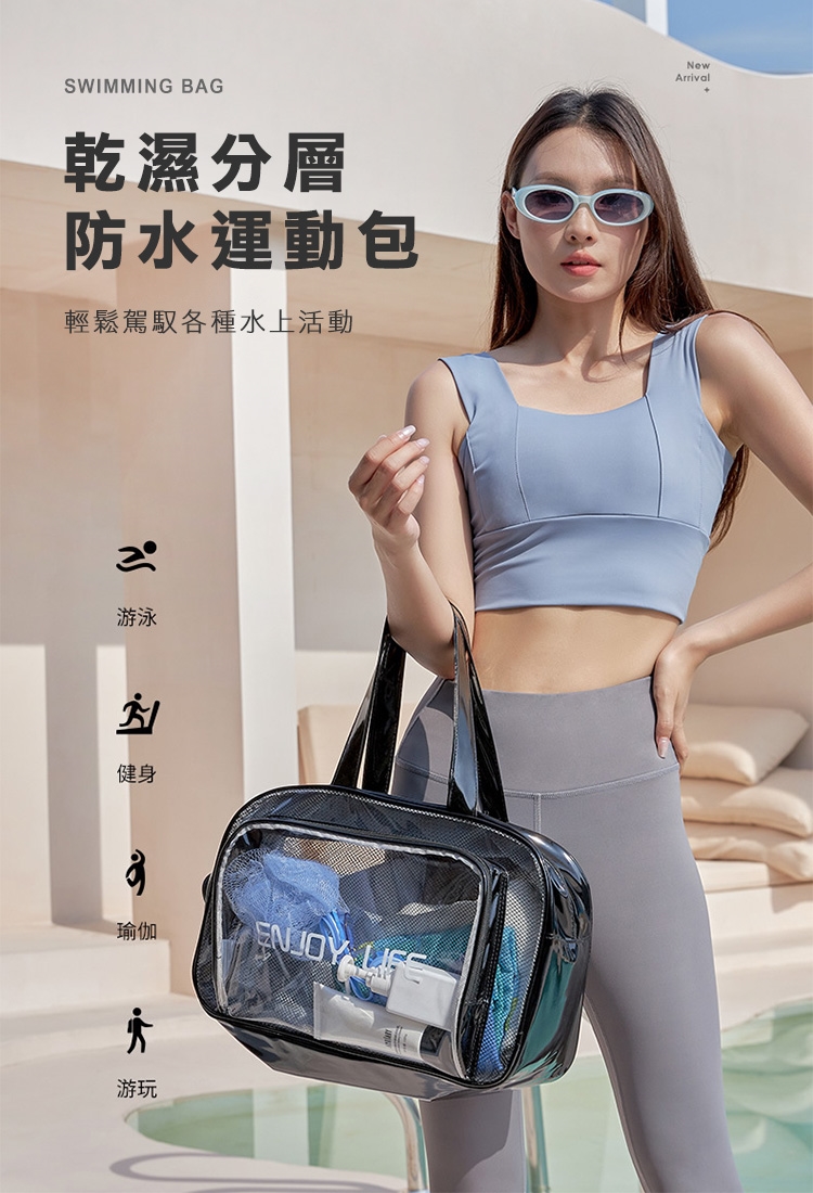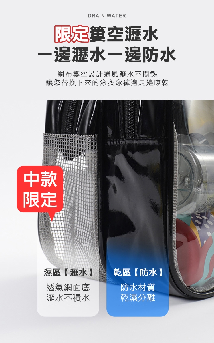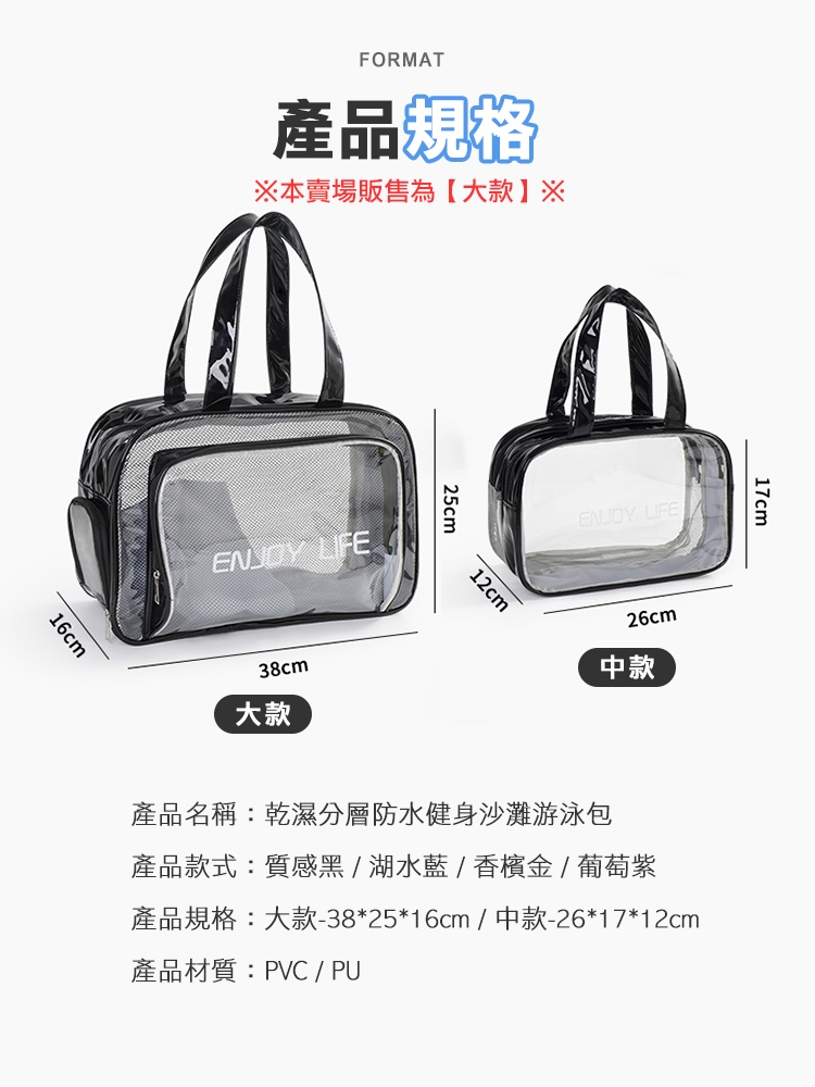 乾濕分層防水健身沙灘游泳包,大款中款兩個恰恰好,大款限定獨立鞋倉,可收納90%的女海灘鞋;中款限定簍空網布,通風瀝水不悶熱;兩包款皆採用防水材質,兩格設計可乾濕分離收納,讓您無懼玩水,水上活動帶著走!