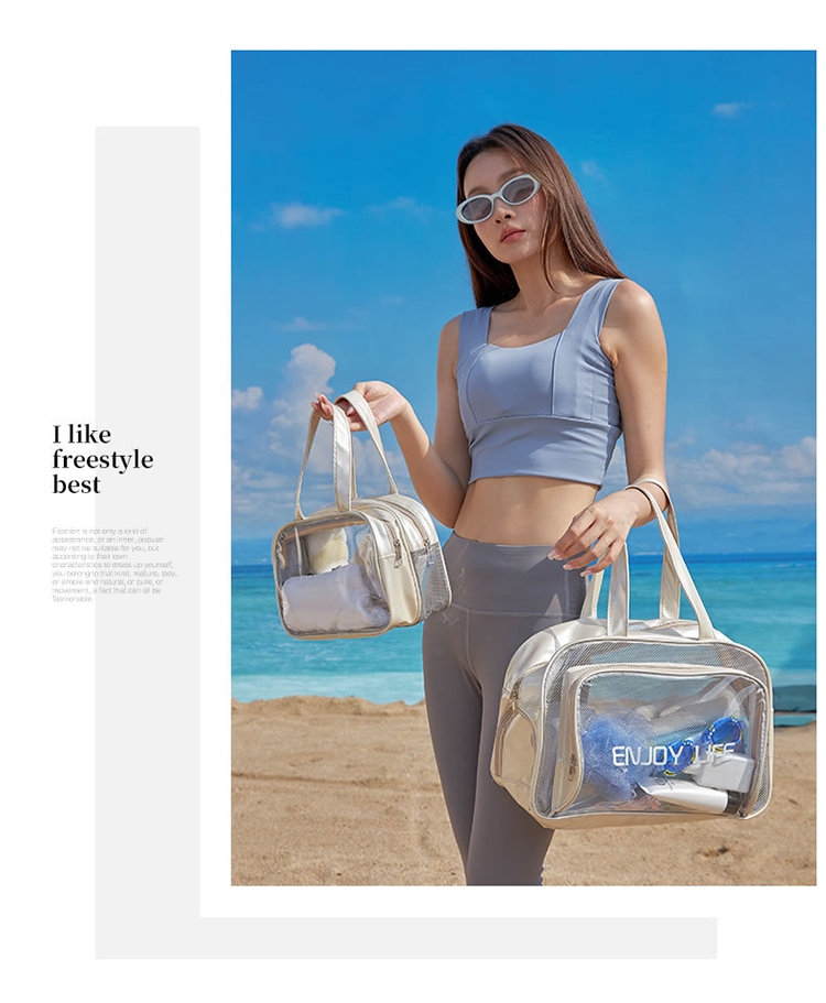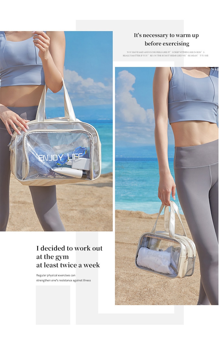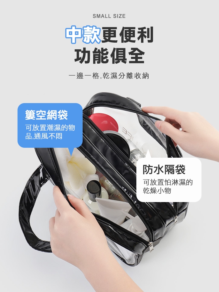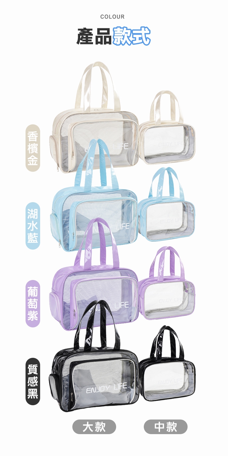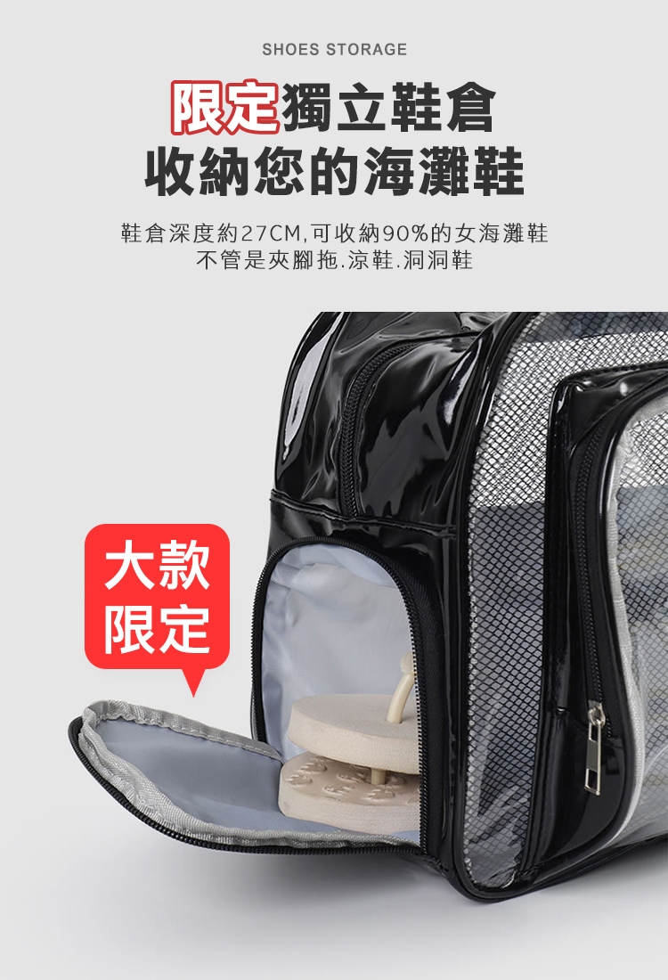 乾濕分層防水健身沙灘游泳包,大款中款兩個恰恰好,大款限定獨立鞋倉,可收納90%的女海灘鞋;中款限定簍空網布,通風瀝水不悶熱;兩包款皆採用防水材質,兩格設計可乾濕分離收納,讓您無懼玩水,水上活動帶著走!