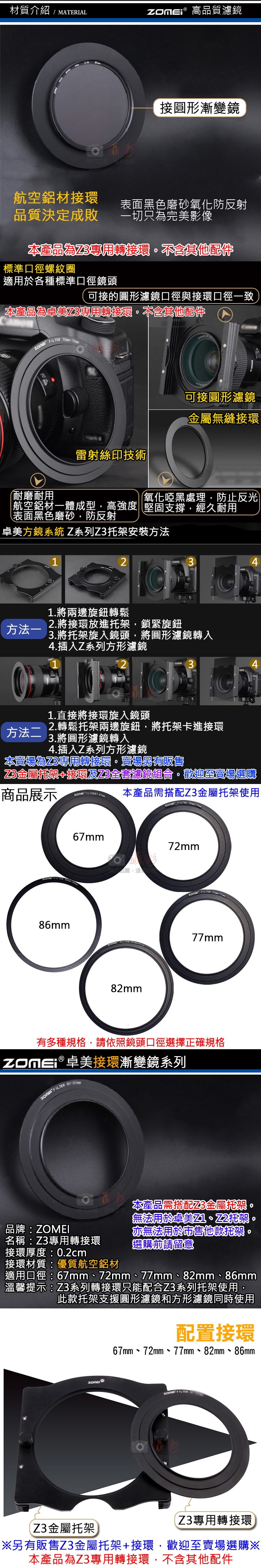 ★本賣場為卓美Z3專用轉接環,另有販售卓美Z3金屬托架+接環、卓美Z3系列方片濾鏡套組、卓美方片濾鏡及卓美16片方形濾鏡包,歡迎至賣場選購★
