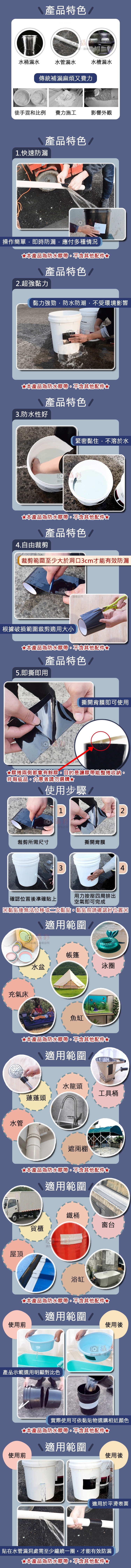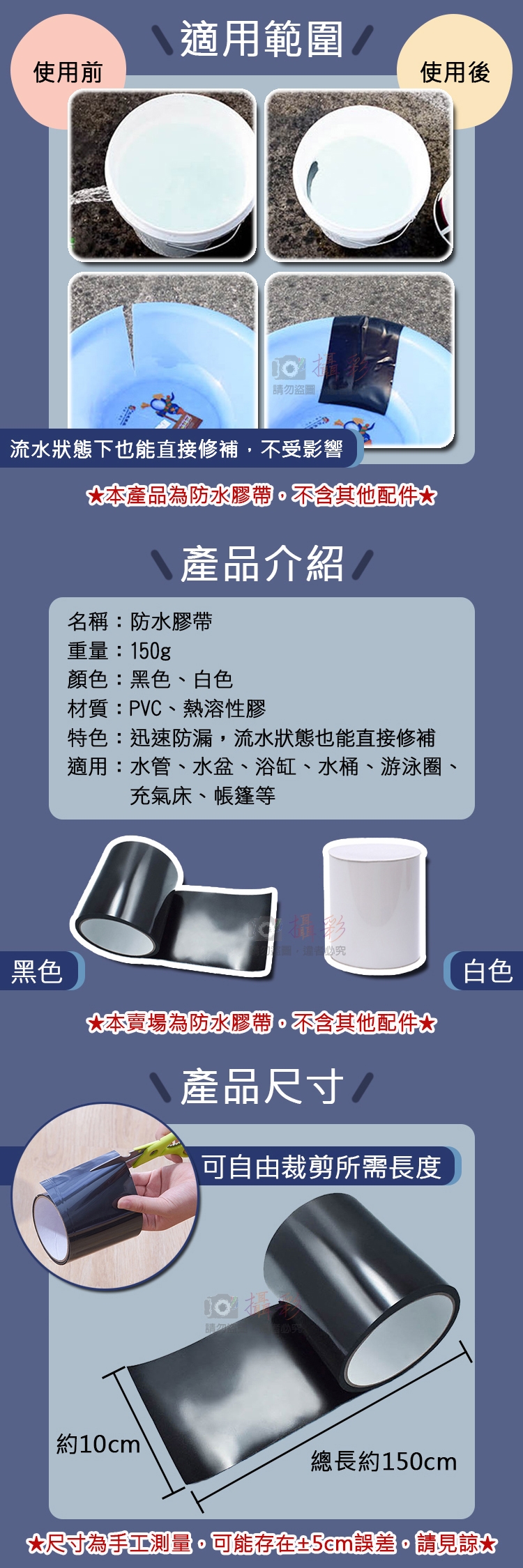 防水膠帶能夠瞬間密封流水,快速覆蓋大面積的裂縫和破洞,可在貼上的瞬間修補完成,就算水壓強勁的漏水洞口亦一貼即妥,防水特性更可將整張膠貼放進水中黏貼,牢固貼上不怕掉落,瞬間解決各種居家煩惱,且適用於多種材質,在突發情況如屋頂破損、水管破裂、雨傘、帳篷破洞漏水等情況,防水膠帶能立即修補