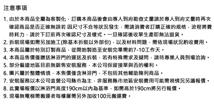 ◆ 本產品為接單後才生產之客製化服務,訂購前請先審慎確認、評估使用區域,並利用客服電話確認是否合適使用。本系列產品除產品瑕疵可以換貨外,將不接受退貨。請消費者慎重購買此類商品,感謝您的配合。